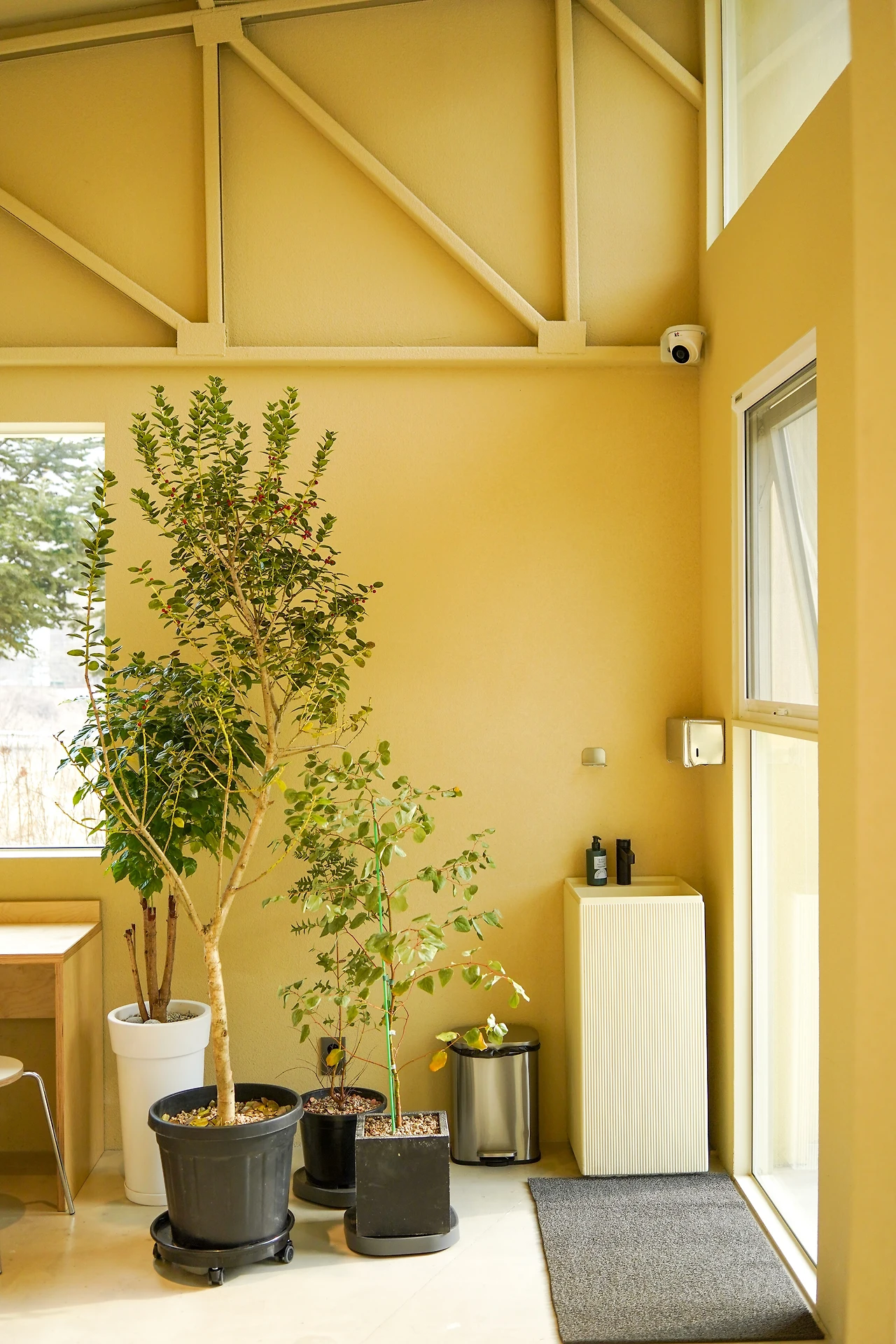 다시 돌아와서 까페 이야기를 하자. 먼저 공간이다. 전면에서 보이면 층고가 매우 높아보여서 2층처럼 보이기도 하지만 사실은 이 곳은 단층으로 되어 있고, 지붕을 비스듬하게 만들었다. 지도상에서 보면 전면쪽이 남쪽인데, 일조량을 많게 하기 위해서 이렇게 짓지 않았을까, 그리고 눈이 오거나 비가 오면 잘 흘러내리라고 지붕은 비스듬하게 만들었을 것 같기도 하다. 그리고 안쪽은 깔끔한 크림색으로 전체 색상이 맞추어져 있다. 곳곳에 나무들이 있어 겨울인데도 불구하고 초록을 느낄 수 있게 해준다. ‘피크닉’이라는 컨셉에 맞게 이런 부분을 신경쓴 거 같아 보인다. 바깥의 자연 풍경과 조화를 이루는 인테리어다.