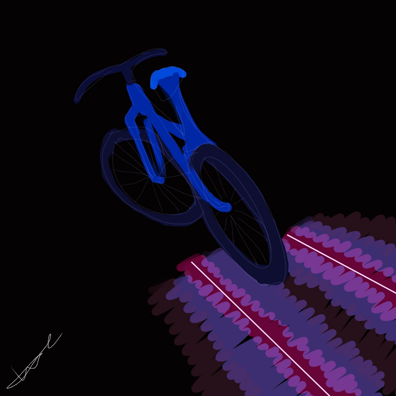 그리고는 자전거 안장 뒤쪽에 몰래 붙여 놓았던 라이트를 켰다. 원래도 라이트가 있었지만 이번 건 좀 달랐다. 라이트를 켜니 자전거 바퀴 쪽으로 선이 그어지면서 자전거가 가는 길이 만들어졌다.