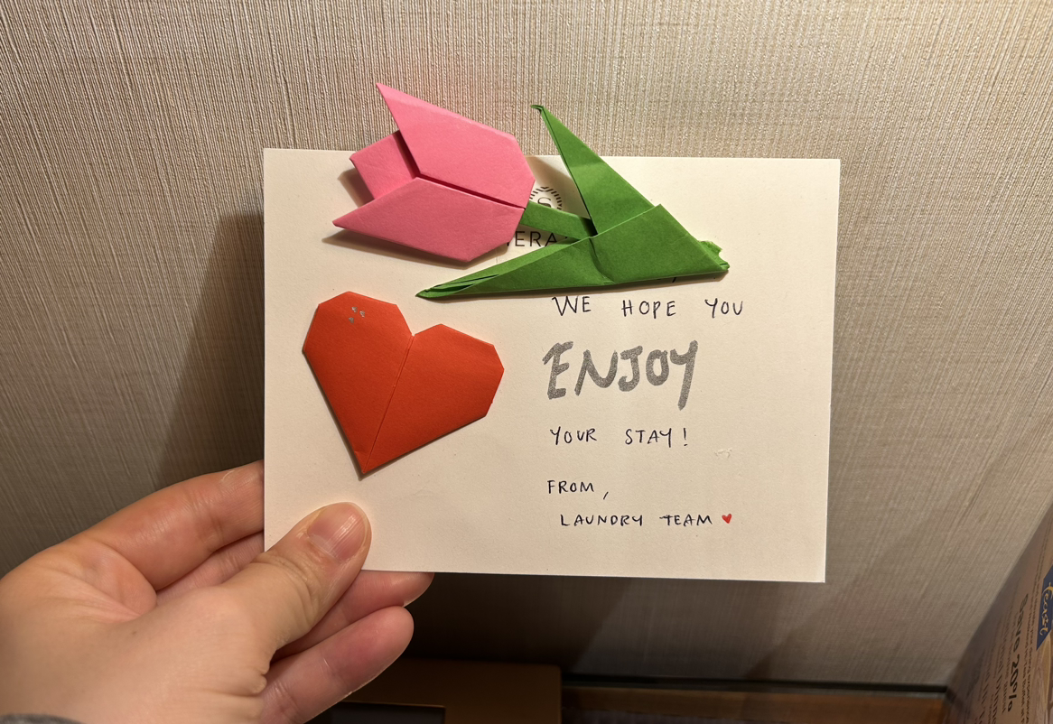 투숙기간을 잘 즐기라는 평범한 멘트였지만 손글씨에 종이 접기로 만든 하트를 정성껏 붙여준 게 너무 고마웠다.