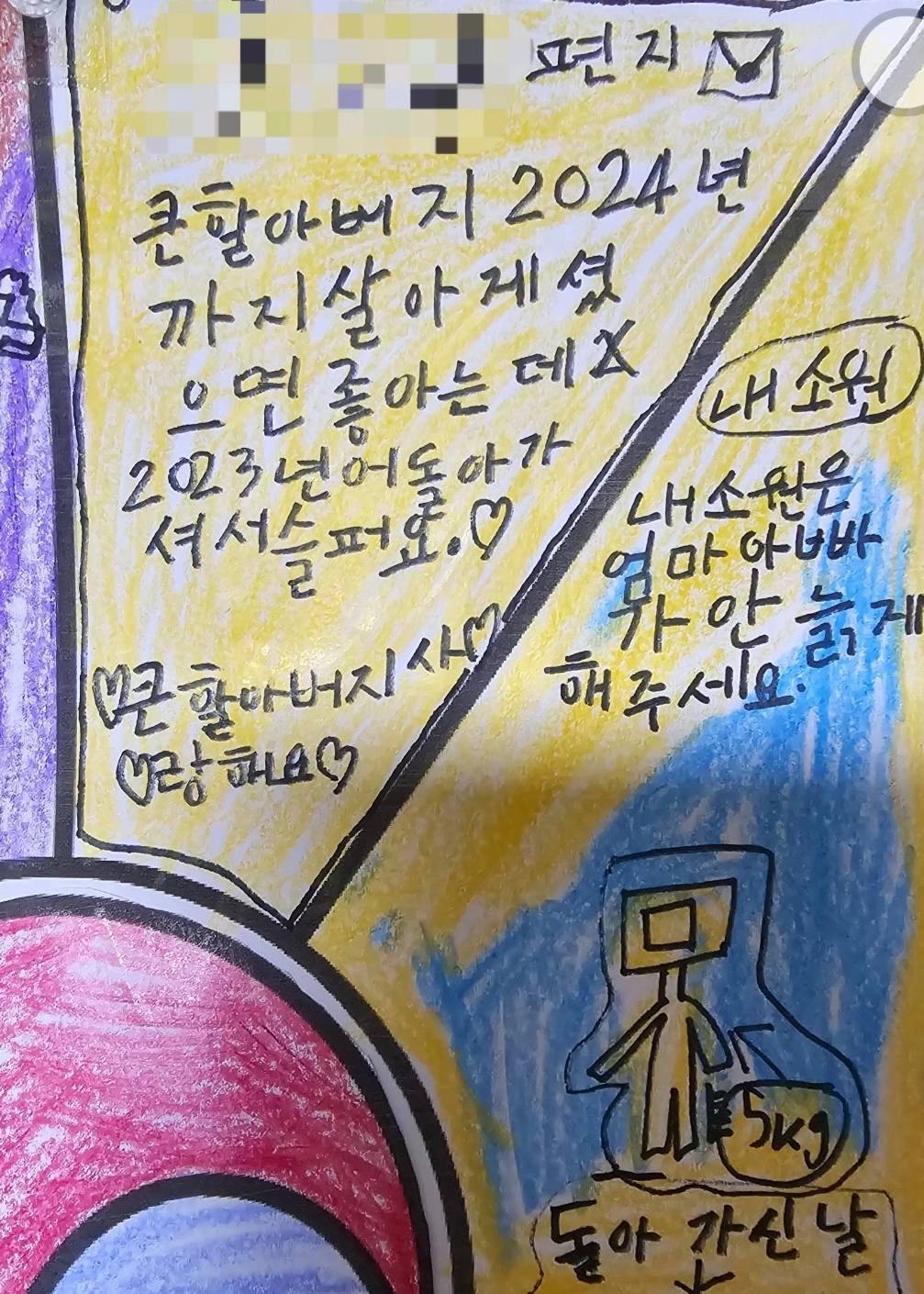작년이었다. 지병이 있으셨던 큰 아버님... 코로나 감염으로 급격하게 병색이 안 좋아지면서 병원에 입원하게 되었고 잠깐 차도가 있는 듯했다가 결국 우리 곁을 떠나셨다. 큰집이 윗지방이라 장례식장으로 먼 길을 가야했다. 감당하기엔 둘째는 무리가 있어서 친정부모님께 맡기고 큰아이만 데리고 갔다. 윗지방에 사시다 보니 큰 명절이 있을 때만 찾아갔었더랬다. 인사드리러 가면 거동이 불편하셔서 소파에 앉아 아이들 재롱부리는 모습을 예쁘게 봐주시곤 했다. 꼬물이들을 위해서 늘 기도해주신 큰아버님... 친할아버지처럼 자주 뵙는 게 아니었는데도 아이는 큰할아버지에 대해 기억하는 일들이 많았었나 보다. 아이를 데리고 장례식장 갈일이 종종 있었지만 잘 기억 못하는 나이라며 아이의 마음에 대해선 신경 안쓰고 있었는데(신경쓸 여력도 없기도하고....) 집안 큰 어른의 장례이기에 아이도 기억하고 생각이 났었던 것 같다.