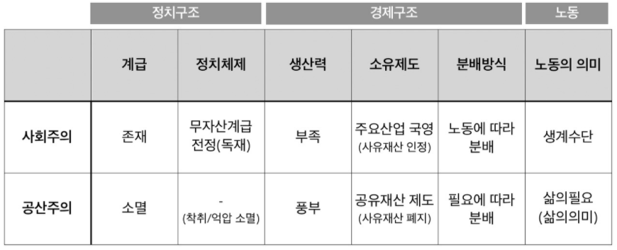 우선 사회주의 사회에서는 아직까지 계급이 남아 있어 무자산계급의 전정(독재)이 불가피하다. 여기서 공산당 집권의 정당성이 나온다. 공산당이 바로 무자산계급의 대표가 아닌가! 반면 공산주의는 이미 계급 구분이 소멸된 사회로 한 계급의 독재와 같은 억압적인 정치체계는 더 이상 필요하지 않다.