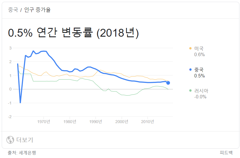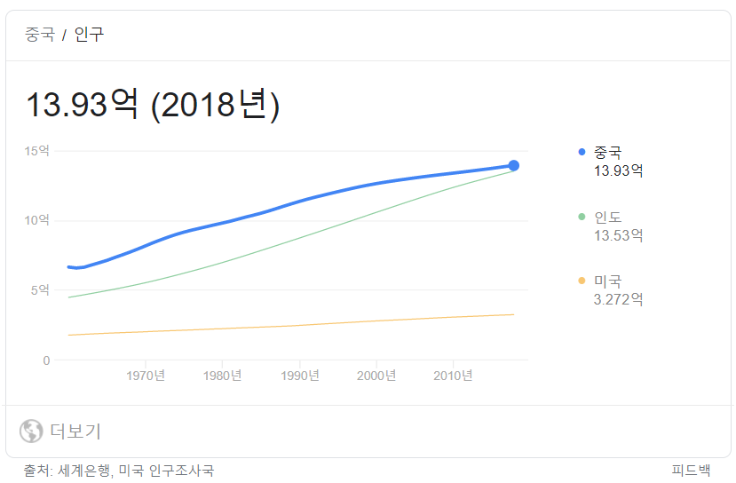 UN 통계에 따르면 중국의 2019년 인구는 14억 3천만 명이라고 한다. 세계은행 자료를 보면 중국, 인도, 미국 인구를 아래와 같이 비교해놓았는데 2018년 기준으로 중국 13.9억 명, 인도 13.5억 명, 미국은 3.3억 명이다. 미국은 중국 인구의 23% 수준이면서 아직까지 세계 최강을 유지하고 있다. 중국과 인도 인구는 계속 증가하고 있다. 한 국가의 경제력은 ( 인구의 양 * 인구의 질 )에 비례한다고 한다. 미국은 해외의 우수 인재를 지속적으로 영입하여 인구의 양과 질이 동시에 올라가고 있다. 반면 중국과 인도는 해외 유입보다는 국내 출산만으로 인구가 증가하고 있다. 행정안전부에 따르면 대한민국 인구는 2019년 11월 기준 5,185만 명이라고 하니 중국은 대한민국보다 27.6배의 인구를 가지고 있다.