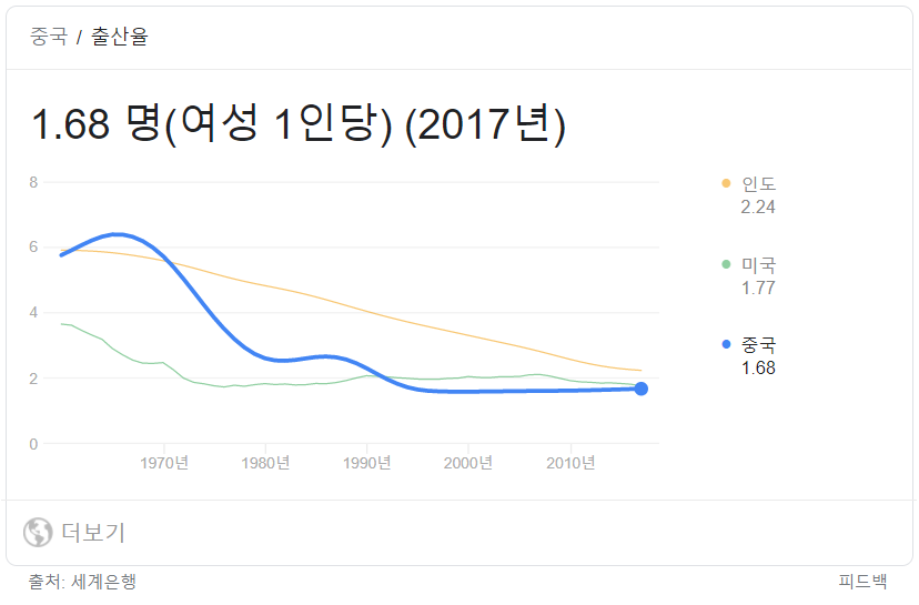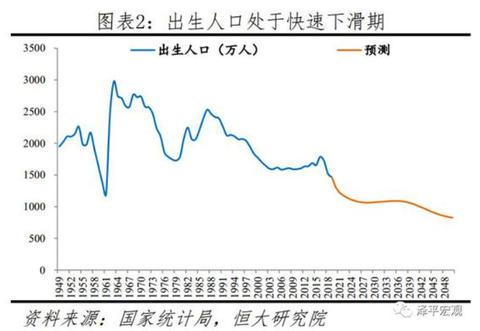 세계은행 통계에 따르면 중국의 인구 증가율은 지속적으로 하락하고 있다. 출산율은 2017년 기준으로 1.68명이라고 하는데(세계은행), 위키피디아에 따르면 2017년 중국 대륙 기준으로 1.59명이라고 한다. 헝따 연구원은 향후 출산율이 1.35까지 하락할 것이라고 전망하고 있다. 한국은 2018년 기준으로 0.98명으로 세계 꼴찌 수준이다.