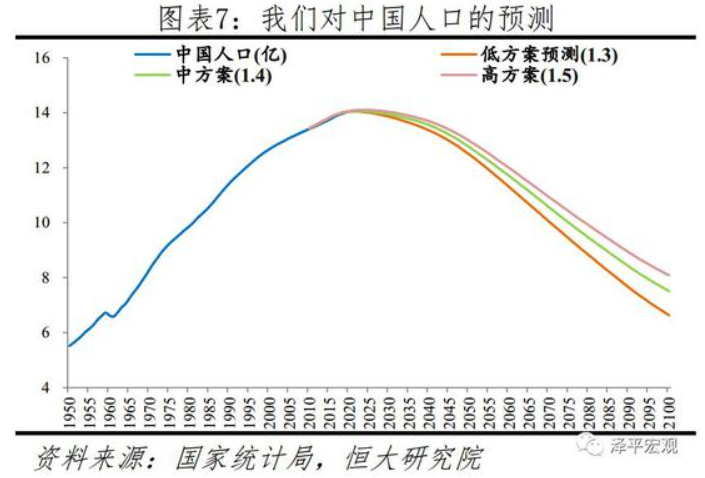 일반적으로 65세 이상이(고령인구) 전체 인구의 7% 이상이면 고령화 사회, 14% 이상 고령 사회, 20% 이상 초고령 사회로 보고 있다. 헝따 연구원은 위와 같은 출생률, 인구증가율이 유지된다면 중국은 2022년 65세 이상이 14%를 넘어 고령사회, 2033년이면 초고령 사회에 진입할 것이라 예측하고 있다. 참고로 우리나라는 2017년 고령인구 비율이 14.2%가 되어 고령사회에 진입했다. 일본은 2020년 4월 기준으로 고령인구가 28%에 육박했다.