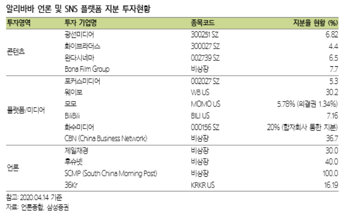 언론 및 SNS 플랫폼 사업자에 대한 투자도 활발하다. 알리바바는 112년 전통의 홍콩 영자지 사우스차이나모닝포스트지(SCMP)의 100% 지분을 2016년 인수했다. 중국의 트위터인 웨이보에도 30%의 지분을 가지고 있다. 이외 여러 콘텐츠 회사, 언론사 등에 투자하고 있다.