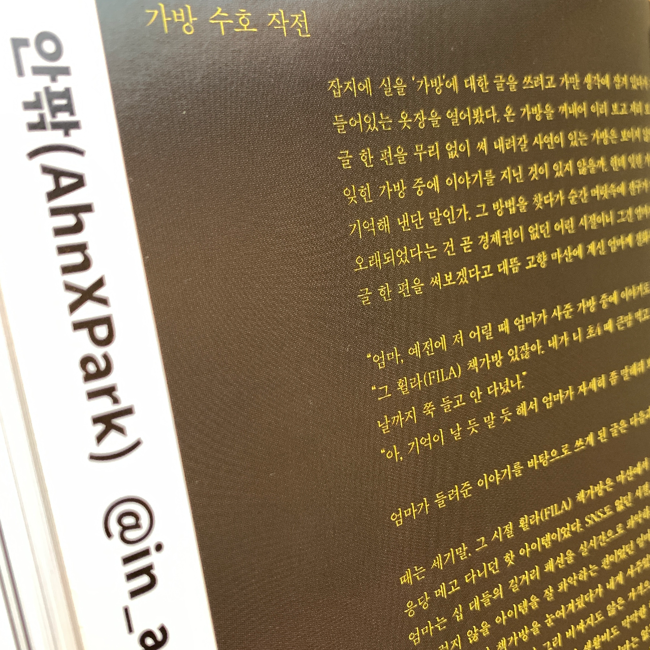 잡지에 실을 ‘가방’에 대한 글을 쓰려고 가만 생각에 잠겨 있다가 옷장을 열어봤다. 온 가방을 꺼내어 이리 보고 저리 보고 눈을 씻고 보아도 글 한 편을 무리 없이 써 내려갈 사연이 있는 것은 보이지 않았다. 그렇다면 이미 잊힌 가방 중에 이야기를 지닌 것이 있지 않을까. 헌데 이미 잊힌 것에 무엇이 있을지 무슨 수로 기억해 낸단 말인가. 순간 머릿속에 전구가 반짝 빛났다. 잊힐 만큼 오래되었다는 건 곧 경제권이 없던 어린 시절에 엄마가 사준 가방일 거다. 대뜸 고향 마산에 계신 엄마에게 전화를 걸었다.