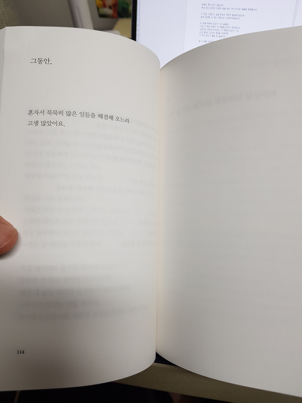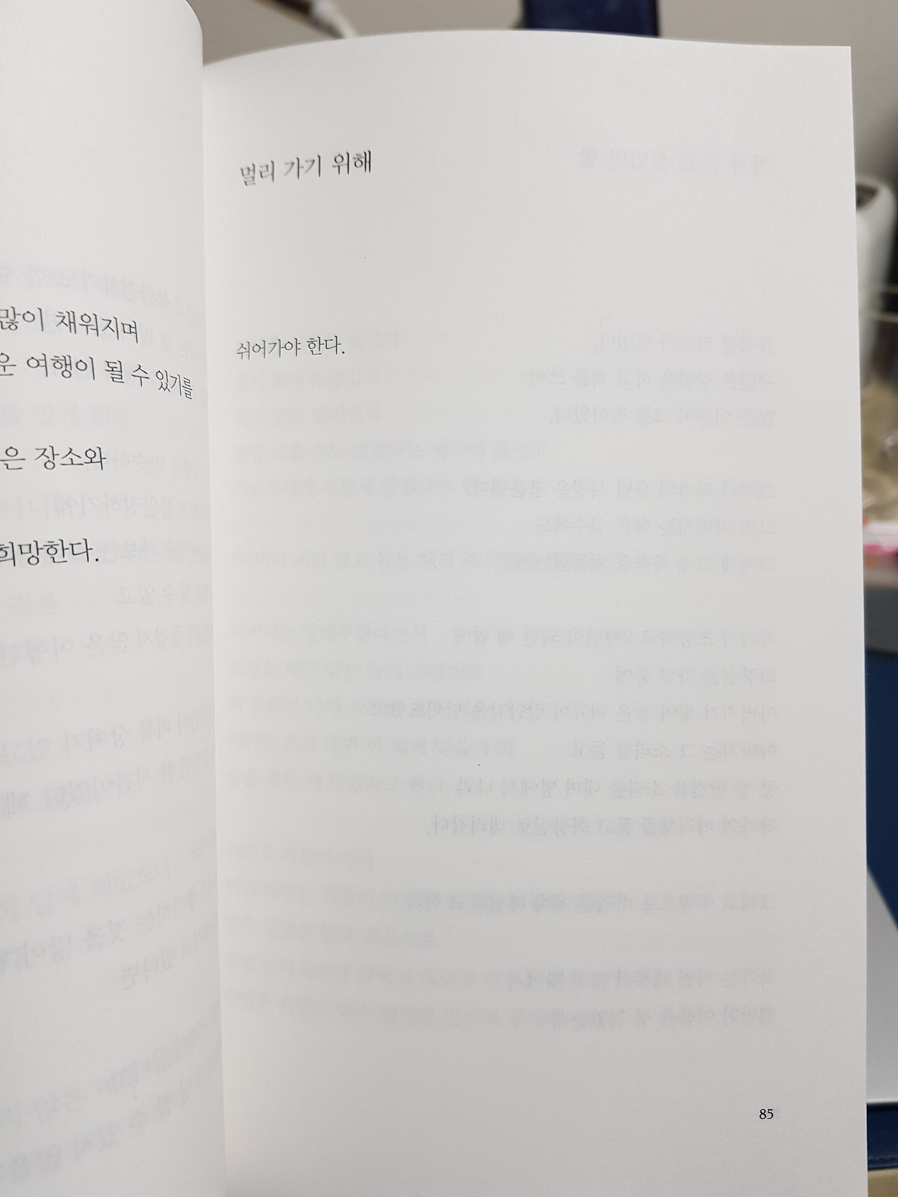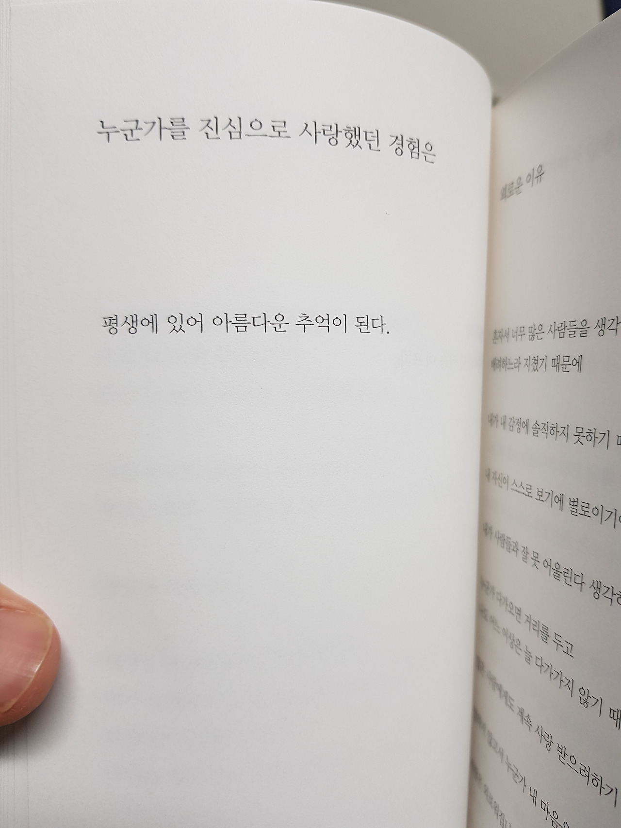 첫째는 책이 읽기 쉽습니다. 책은 읽고 싶지만 빼곡한 글을 읽는 것이 버거운 분들께 추천합니다. 이 책은 시집인가 싶을 정도로 여백이 활용되어있으며 쉽게 공감할 수 있는 내용으로 구성되어있습니다. 두 번째, 제목에 공감이 가는 분들께 추천 드립니다. 사실 이 책은 제목이 큰 역할을 한다고 생각합니다. 감성적인 글귀로 되어있는 이 제목에 공감이 가고 현재 삶이 무기력한 상황인 이들에게 좋은 책일 듯싶습니다.
