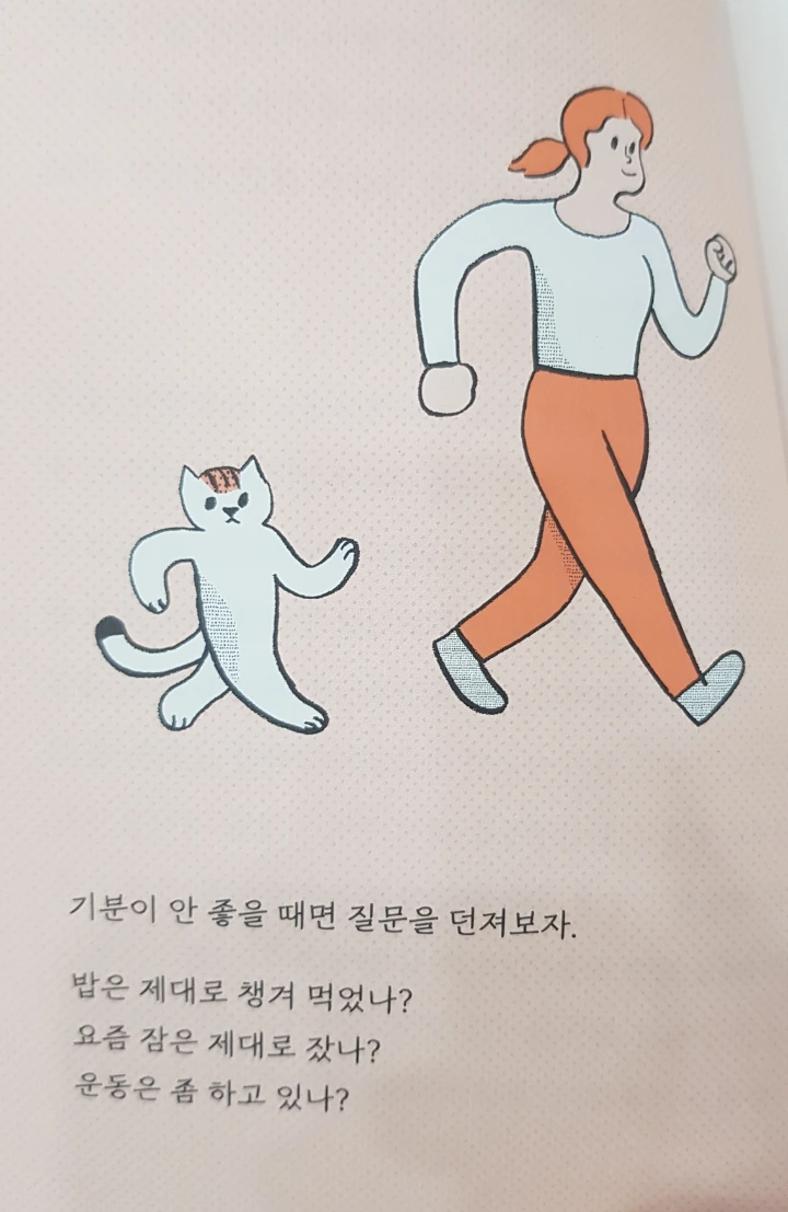 내게 이 질문들을 던져보면 역시나, 내 몸을 잘 돌보지 않고 있을 때가 많았다. 이럴 때마다 나는 속으로 안도했다. 도저히 이유를 알 수 없는 기분 변화가 정답이 모호한 논술 문제라면 몸 상태로 인한 기분 변화는 정답이 확실한 수학 문제 같았기 때문이다. 몸은 거짓말을 하지 않아서 운동을 하는 것만으로도, 잠을 충분히 잘 자는 것만으로도 기분이 한결 나아졌다.