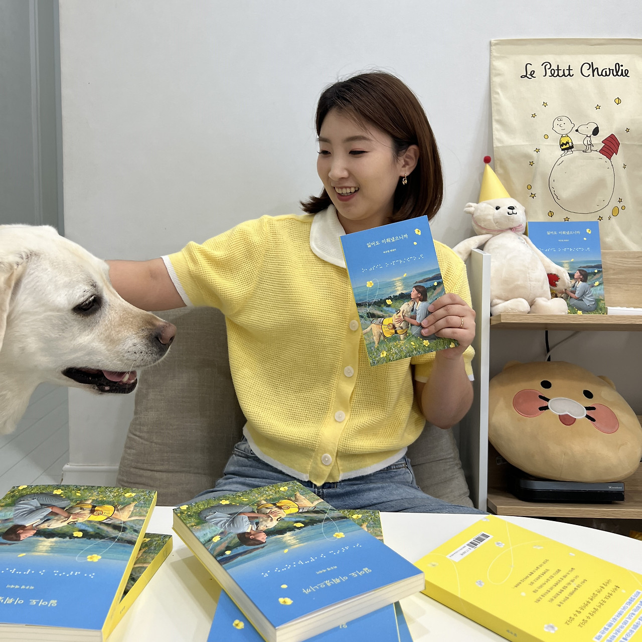 Q5. 책을 처음 봤을 때, 청량한 색감의 표지가 시선을 사로잡는데요. 작가님과 하얀이가 행복하게 보여서 시선을 뗄 수가 없습니다. 표지에 작가님과 하얀이가 나오는 사진을 선택하신 이유가 있으실까요?