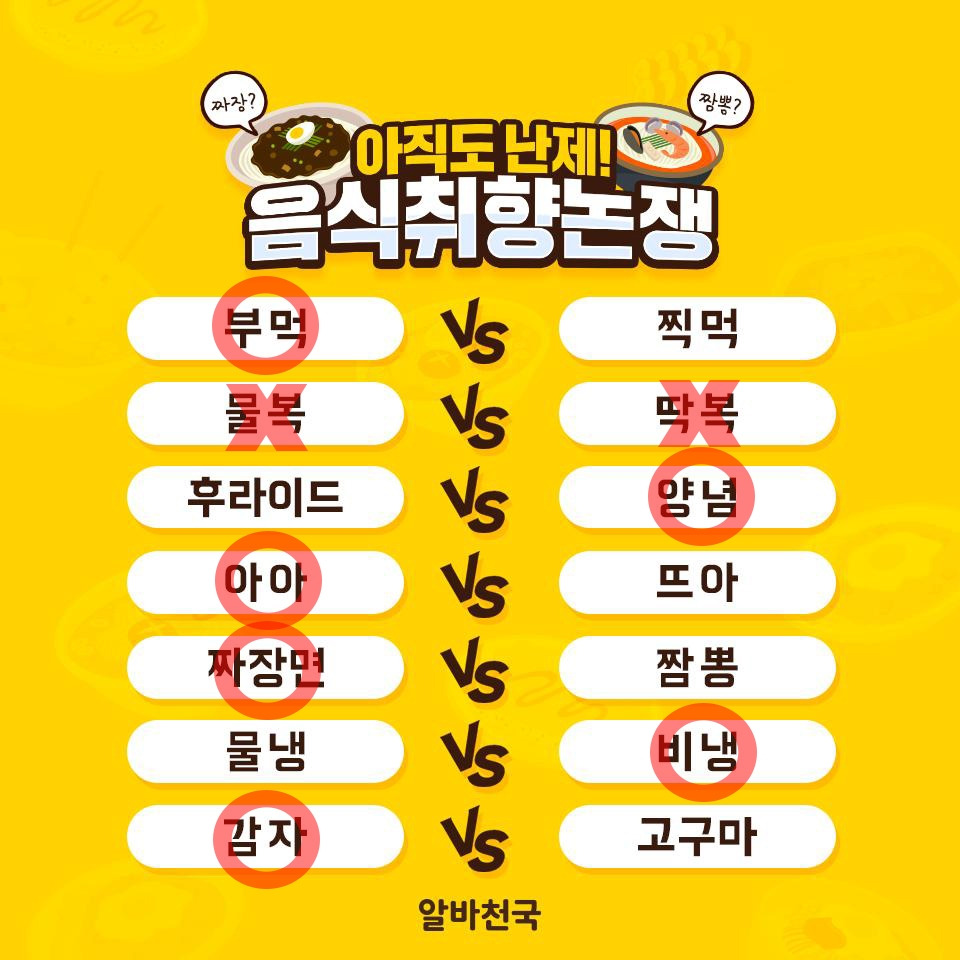 취향은 비교적 알기 쉽다. 흐물파(마이너)다. 탕수육? 부먹, 시리얼? 눅눅, 라면? 퍼진 면! 하지만 이 부분에선 강경은 아니다. 편식으로 이미 유난 떨고 있기 때문에 잘 먹는 음식으로는 유난 떨고 싶지 않다. 민초도 당연히 싫지만, 오버하는 사람이 더 싫다. 음식은 안 가리고 잘 먹는 사람이 최고다.