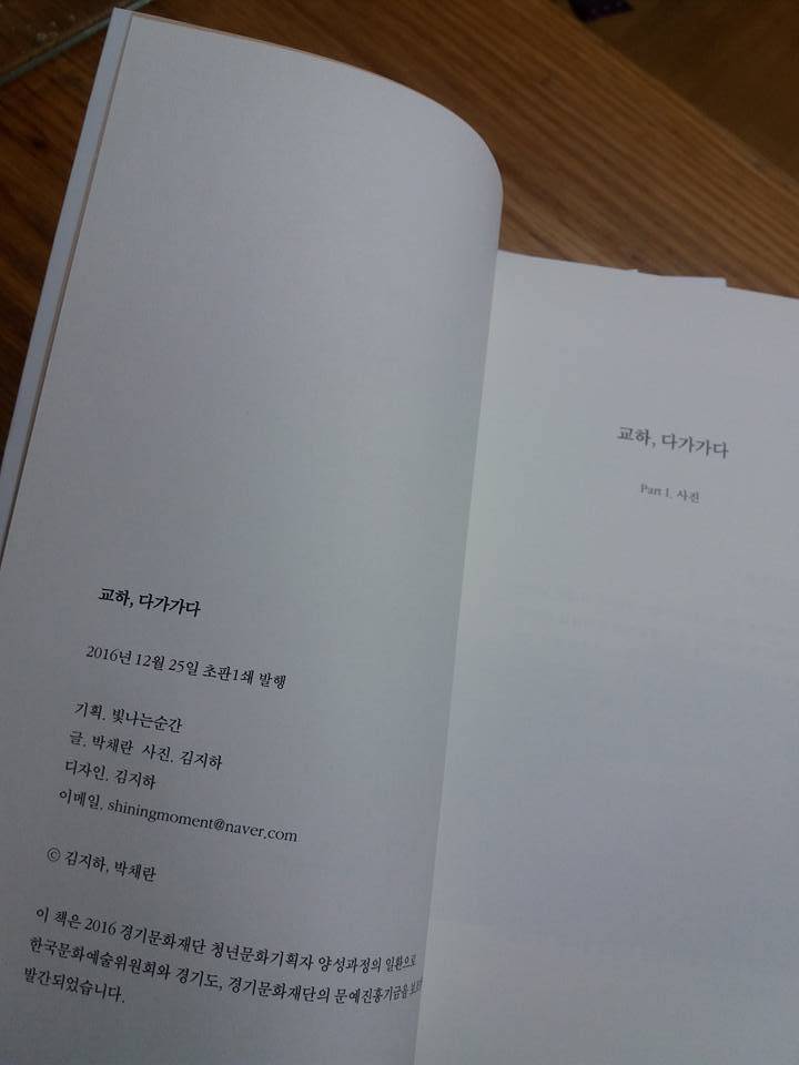 방금 들려드린 건 제가 동화작가 박채란씨와 함께 '빛나는 순간'이라는 이름으로 작년 겨울에 아주 서투르지만 처음으로 인터뷰와 사진이 함께 들어가 있는 작은 책자를 하나 만들면서 쓴 글이에요. 오늘은 채란씨가 사정상 함께하지 못해 아쉽지만 저와 채란씨가 그때 만났던 교하를 소개해 드리고자 합니다. 사실 다음 강의부터는 정말 쟁쟁한 저자분들이 오셔서 책과 함께 멋진 강의를 해주실 건데, 첫 문을 제가 열어도 되나, 아니다, 절대 안된다, 뭐 이런 생각이었는데요. 오히려 교하에 살고 있는 굉장히 평범한 저 같은 사람이 평범한 이야기를 하면서 시작하는 것도 나쁘진 않겠다는 생각이 들어서 이렇게 나오게 되었어요. 사실, 제가 요즘 교하에서 이런저런 프로젝트들을 벌이며 바삐 지내고는 있지만 정작 저의 이야기를 들려드린 적은 많이 없었던 것 같아요. ‘쟤는 왜 저런 일을 하지?’ ‘사진을 찍는다고는 하던데... 작가인가? 선생인가?’ 이런 질문들을 가지고 계셨던 분들도 있을 거에요. 그래서, 오늘은 저의 이야기를 쑥스럽지만 조금 해보려고 해요.
