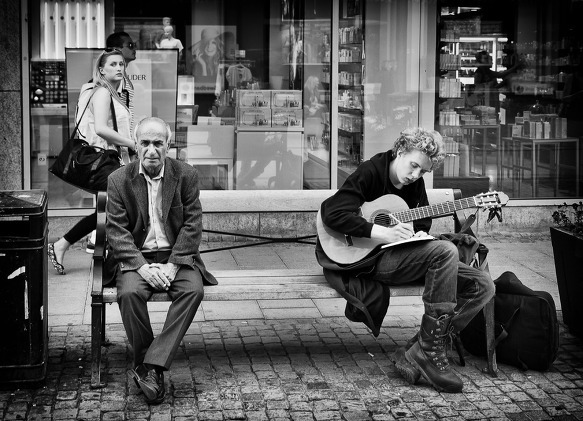 그래서 저는 이 사진을 선택했어요. 이 사진에는 제가 좋아하는 기타도 보이고, 몇 십년 후엔 벤치에 앉아 있을 할아버지인 내가 보이고, 또 제가 젊었을때에 만났던 여자친구가 지나가는 모습도 보이더라구요. 또 다르게 보면 사진속의 등장 인물들은 각각 다른 말을 하고 있는 것 같았어요. 청년은 좋은 노래를 만들어 잘 부르고 싶다고, 벤치에 앉아 있는 할아버지는 나는 외로워보이지만 즐거웠던 젊은 날들을 생각하고 있는 거라고, 거리를 걷는 여인은 좀 더 멋진 남자를 찾고 있다고 말이죠. 이렇게 웃고 싶은 삶을 위해 서로 작당하는 방법은 제각각이겠다 싶어서 이 사진을 골랐습니다.