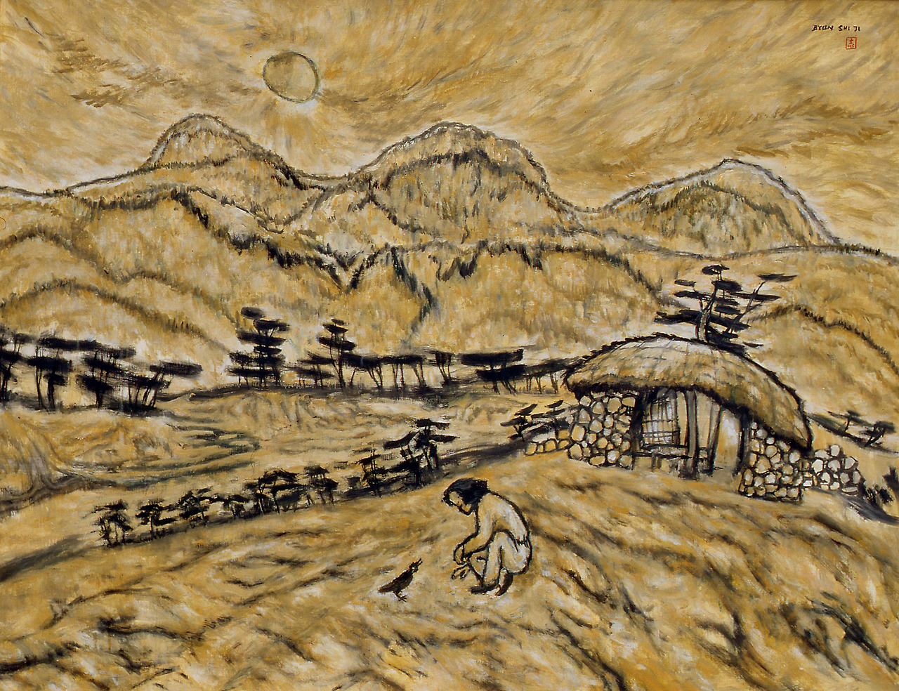 <"폭풍의 화가"라 불리는 변시지는 1926년 제주도에서 태어나, 1945년 오사카 미술학교를 졸업, 조선인 최초로 일전(日展)에 입선하였으며, 1948년 일본의 최고 중앙화단인 광풍회의 최고상을 수상하였다. 1957년 한국에 돌아와 서라벌 예술대, 한양대 등에서 가르쳤으며, 1975년에 제주대학교로 옮겨 작품활동을 하였다. 2013년 6월 지병으로 별세하였다.>