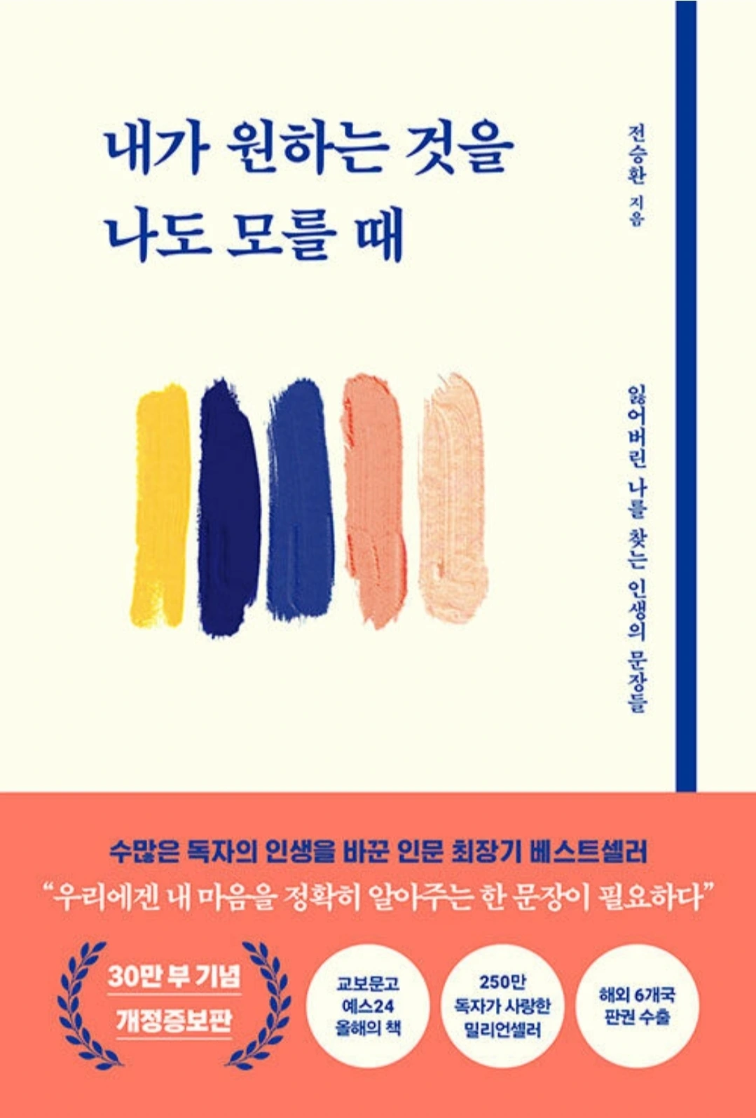 30만부 기념 개정증보판! 전승환 저자의 <내가 원하는 것을 나도 모를 떄>는 잃어버린 나를 찾는 인생의 문장들을 담은 인문 에세이이다.