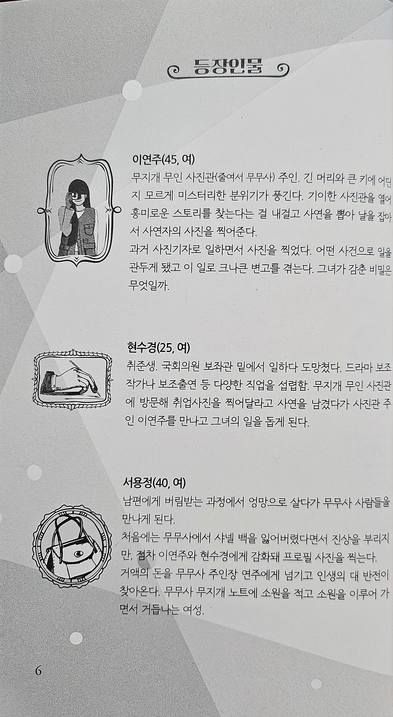 추리소설 작가로 잘 알려진 김재희 작가의 힐링소설! <무지개 무인 사진관>은 우리 주변에서 흔히 볼 수 있는 스티커 사진기가 있는 무인 사진관에서 노트를 매게로 하여 사진관 주인과 손님들이 서로 사연을 주고 받으면서 감동을 느끼게 되는 작품이다. 다양한 사연을 가진 사람들이 방문하게 되는 무지개 무인 사진관에서는 전직 사진기자로 무무사(무지개 무인 사진관을 줄임말.)를 운영하며 남모르는 비밀을 지닌 사진관 주인장, 보이스피싱 조직과 연루되어 취업 사기를 당한 취업준비생, 힘든 연애 대신 애니메이션 캐릭터 덕후가 된 IT 개발자, 남편과 이혼하고 절망에 빠져 자포자기한 중년 여성 등 흔히 우리 주변에서 보는 이웃들이 무무사라는 곳에서 만나 서로의 온기를 따스하게 나눈다. 각자의 고민과 아픔을 안고 무무사를 찾는 이들에게는 작은 기적과함께 성장하는 모습을 보면서 나도 모르게 힐링이 된다. 따뜻한 감동과 함께 힐링을 선사하는 <무지개 무인 사진관>은 사진관 주인과 손님들이 남긴 글과 사진을 통해 서로를 이해하고 공감하면서 읽게 되는 이 작품은 누군가에게 위로가 되는 작품이다. 힘든 현실을 극복하고 앞으로 나아갈 수 있게 용기를 주고, 새로운 마음으로 세상을 바라보게 한다.