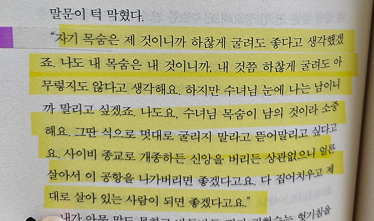 댁이 하루를 사는 사람이든 한 시간을 사는 사람이든, 1분을 사는 사람이든 마찬가지예요. 죽음을 생각하며 살아서는 안 돼요. 1초를 살아도 조금 있다가 죽는다고 생각하며 살아서는 안 된다고요. 현수 씨 영혼을 만든 신에 대한 모독이에요. 그러니까 지금 당장 믿음을 바꿔요, 알아들어요?