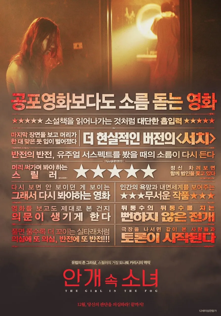 범죄를 사람이 관계된 사건이 아닌 막대한 수익이 창출되는 또 다른 리얼리티 쇼로 소비하는 현대인의 민낯을 본격적으로 다룬 작품 <안개 속 소녀>는 하루에도 수백건 이상 벌어지는 범죄 중 어떤 사건이 언론과 대중의 관심을 받아 범국민적 이슈가 되고, 동시에 어떻게 돈을 벌이는지에 대한 내용을 다룬 영화의 시나리오를 썼고, 이를 미리 읽은 주변인들의 설득에 소설로 재집필하여 장편소설 <안개 속 소녀>를 출간까지 한 작품이다. 지나치게 잔혹한 묘사를 배제하고 어느 작품보다 몰입도가 높고, 범인이 밝혀지기까지 읽는내내 혼란에 빠지게 되고, 그리고 연이은 반전들이 여전히 충격적이고 날카로운 작품이다. <안개 속 소녀>는 이탈리아의 국민배우 토니 세르빌로와 우리에게는 영화 <레옹>으로 친숙한 장 르노가 주연을 맡아 2017년 11월에 영화화가 된 작품이기도 하다. <안개속 소녀>는 저자가 어린 시절에 겪은 일에서 시작되었다고 한다. 어린시절에 공원에서 마주친 한 남자가 잠시 부모와 떨어져 있는 그에게 친숙하게 다가왔다고 한다. 낯선 사람을 따라가지 말라는 주의를 수차례 들었던 그였지만 무슨 맛 아이스크림을 좋아하는지 등 다정한 질문을 하는 남자에게 자기도 모르게 다가갔고, 다행히 자신을 부르는 부모의 목소리가 들려 남자는 그곳을 떠났다고 한다. 이 작품은 실제로 저자가 겪거나 혹은 행동과학 범죄학자로서 범죄분석과 자문을 통해 알게 된 사건을 기반으로 집필했다고 한 <안개 속 소녀>는 마치 우리가 맑은 거울을 보는 것처럼 우리의 현실을 비추는 작품이기도 하다. 결말까지 읽다보면 강렬한 충격과 마지막 페이지를 덮은 순간에도 그 공포가 쉽게 가지 않는 작품이기도 했다.