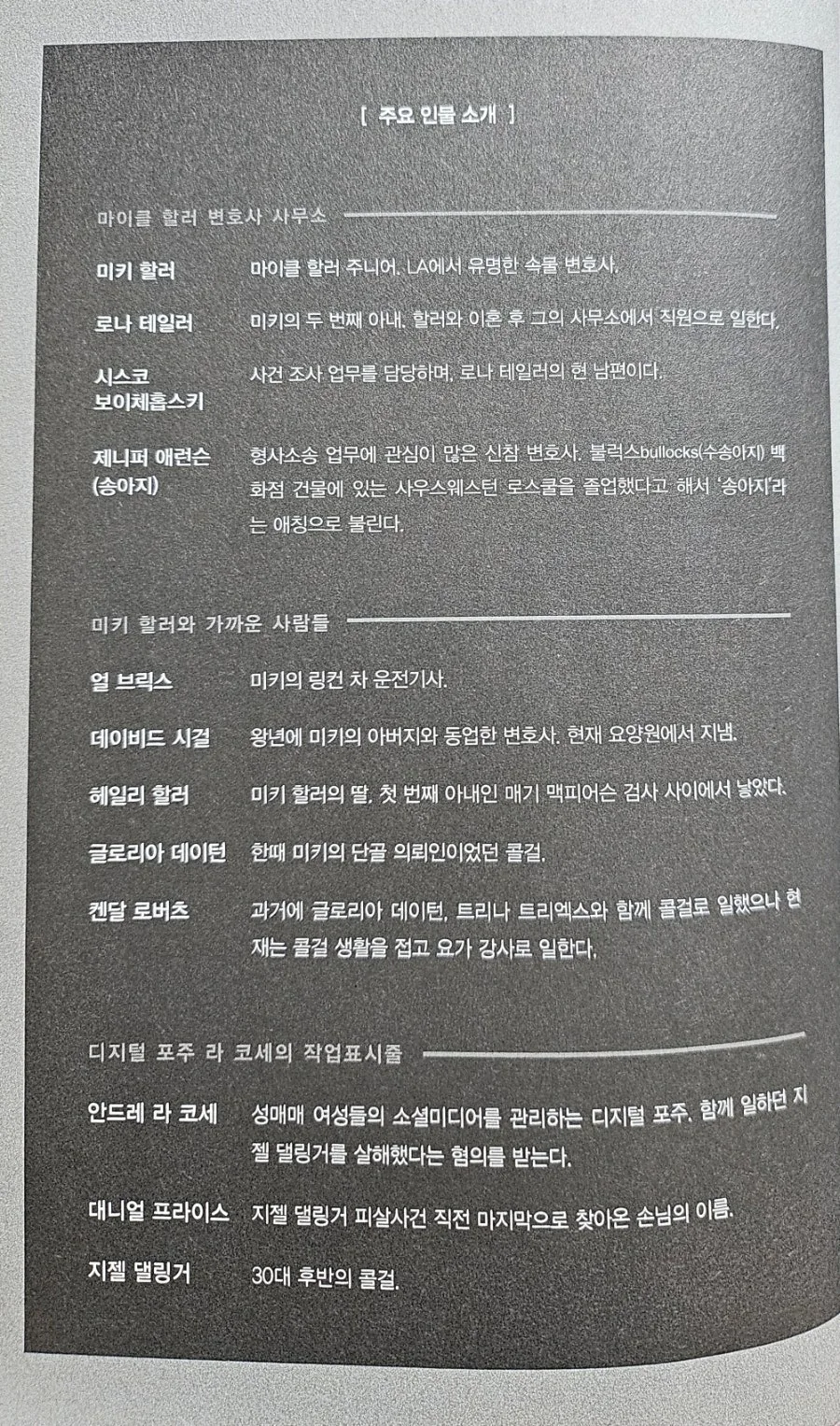 이 작품은 현실적인 이야기도 있다. 바로 마약조직, 디지털 범죄, 법조계의 부패 등 현대 사회 문제를 날카롭게 그려냈다. 인간의 내면과 사회적 문제를 잘 그려낸 <배심원단>은 읽는내내 긴장감은 최고조였고, 법정에서 예상치 못한 반전과 주인공인 미키가 법과 정의에서 어떤 선택을 할지 마지막까지 긴장감의 끈을 놓을 수 없었다. 치밀한 법정 공방과 긴장감 넘치는 전개, 그리고 예상치 못한 반전까지! 너무나 완벽한 <배심원단>! 500쪽이 넘는 어마어마한 분량이지만 가독성과 흡입력이 있을 정도로 아주 빠르게 읽을 수 있는 작품이다. 마치 내가 배심원단 12명에 속해 있는 것처럼 점점 빠져들게 되는 이 작품! 밤늦도록 책장을 넘기게 하는 마력이 있을 정도로 최고의 법정 스릴러 소설로, 마이클 코넬리 거장을 좋아하는 분이라면, 충분히 재미있게 읽을 수 있는 작품이니, 한번 읽어보길 추천한다.