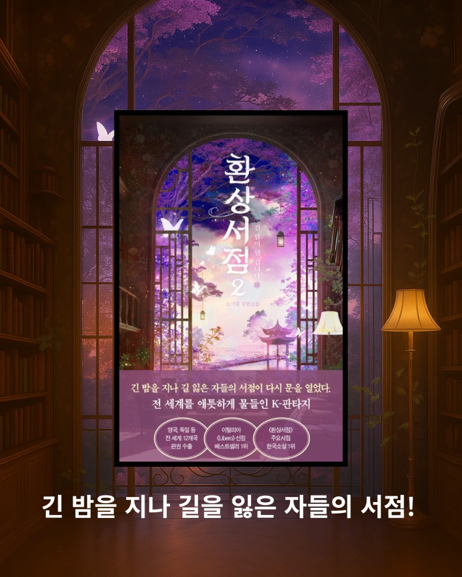 전 세계를 애틋하게 물들인 K-판타지 소설! 소서림 저자의 <환상서점 2 : 긴 밤이 될겁니다>는 전작보다 더 깊어진 세계관과 애틋한 감정선이 돋보이는 K-판타지 힐링 소설이다.