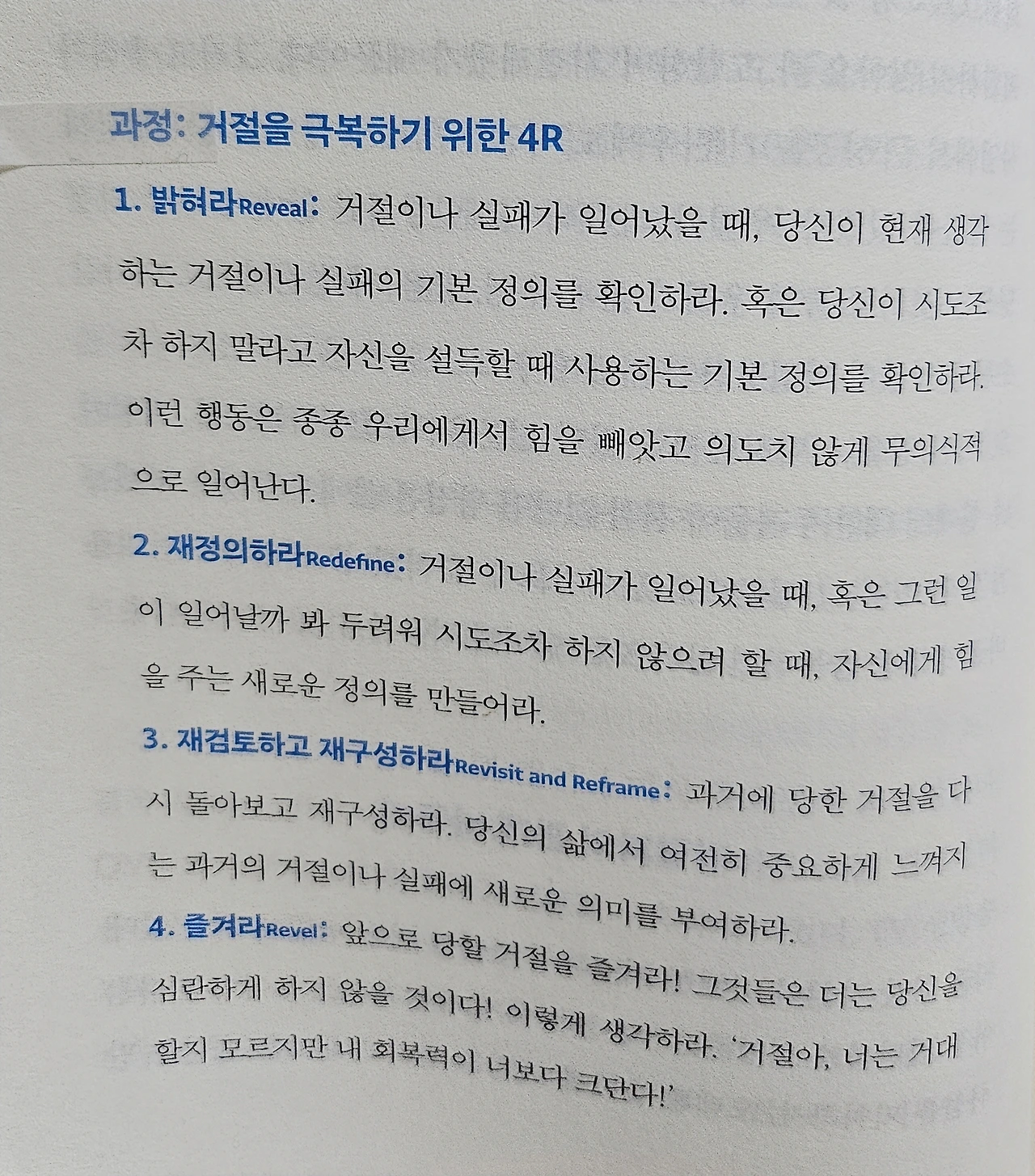 인간은 본능적으로 고통을 피하려 한다. 이것은 생존 본능이다 . 그리고 우리가 충분하지 않거나, 가치가 없거나, 사랑받을 자격이 없다고 느낄 때 엄청난 고통을 느낀다. 그리고 이 모든 고통을 거절이나 실패라는 생각과 마음속에서 연결할 때, 우리는 모험을 꺼리게 되고 꼼짝없이 제자리에 갇혀 소심하게 삶을 살아간다. 우리가 절대 세상 밖으로 나가지 않는다면 거절이나 실패와 함께 찾아오는 고통은 없을 것이다. 우리가 절대 꿈을 좇지 않는다면 꿈이 이루어 지지 않았을 때 당황하거나 낙담할 위험은 없을 것이다. 하지만 거절과 실패가 고통과 위험을 준다고 우리가 생각할 때만 그것들은 그런 의미를 지닌다. 그리고 우리는 그런 생각을 바꿀 수 있다.