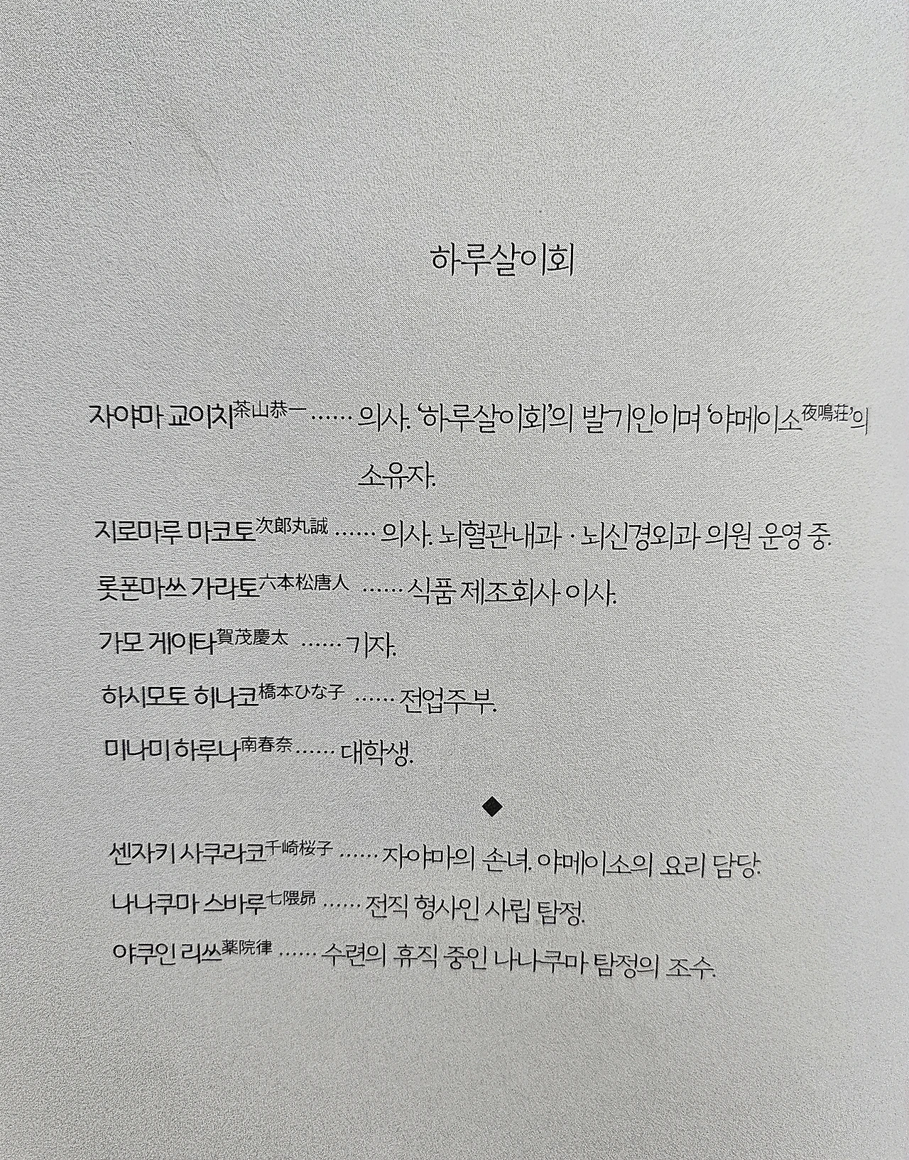 클래식 미스터리의 향수를 느낄 수 있는 이 작품은 저자의 의료 지식이 사건의 현실성과 몰입도를 높임으로써, 의학적 디테일이 대단하다. 미스터리 요소뿐만 아니라 철학적 요소와 사회적 질문까지! '어차피 곧 죽을 사람을 왜 굳이 죽였을까?" 라는 것이 이 작품의 주요 내용이다. 죽음을 앞둔 사람을 살해하는 행위는 생명과 윤리의 경계를 묻고, 시한부 환자들이 모인 '하루살이회' 는 현대 사회의 고령화와 의료 현실을 잘 반영하였다. 또한 노인의 건강, 돌봄, 사회적 고립 등 현실적인 문제를 미스터리 요소에 잘 녹여낸 작품으로, 사회파 미스터리 소설이기도 하다. 외딴 별장에서 벌어지는 살인 사건은 고전 미스터리의 '클로즈드 서클' 의 구조로 보인다. 탐정과 조수가 등장하여 트릭을 설명하는 등, 클로즈스 서클과 본격 미스터리의 규칙을 잘 따른 작품이다. 또 마지막 페이지에서 드러나는 충격적인 진실은 강한 인상을 남길 정도로 미스터리 장르의 묘미를 극대화시킨다. 어정쩡한 클로즈드 서클을 무대로 펼쳐지는 이 작품은 전반부에서는 희생자의 사인을 의학적 견지에서 검증하거나 용의자 한 명 한명을 정직하게 탐문하는 대목이라 다소 지루하게 느낄 수 있지만, 종반부에서는 갑자기 시점이 바뀌어 정신없이 질주하여 앞에서 놓친 것이 없는지 다시 꼼꼼하게 읽게 한다. 진상이 드러나는 마지막순간까지 의외의 반전으로 마무리가 되어, 곳곳에 함정을 숨겨져 있는데, 다 읽고 나서도 다시 처음으로 돌아갈 수 밖에 없다. 한마디로 저자가 파놓은 미스터리의 늪에 점점 빠져들게 되는 것이다. 죽음이라는 보편적 주제를 통해 인간의 본성과 사회의 구조를 돌아보게 하는 이 작품은 죽음을 앞둔 인간의 심리와 윤리적 딜레마를 잘 다루는 작품이다. 또한 저자가 순환기 병원에서 근무하고 있는 의료인이기에, 노인의 건강과 돌봄 문제를 사실적으로 잘 묘사하여 사회적 메시지를 잘 담고 있다. 초고령 사회를 살아가는 이 시대에 실제 현직 의사로 일하는 저자답게 각 인물의 병에 따른 증상과 사인을 하나하나 추리하며 검증하는 과정들이 전문적인 시각에서 묘사하고 있다. 고혈압, 당뇨병 등 관리하며 살아가야 하는 노년기 환자의 일상을 묘사한 부분은 노인의 삶을 자세히 들여다보게 한다. 저자가 죽음을 앞둔 이들을 연민의 눈길로 보거나 우울한 모습으로만 그린 것은 아니다. 나름의 고통이 있다. 하지만 생명이 머무는 동안 하루하루를 최선을 다해 살아가는 이들의 모습을 밝고, 경쾌하게 그려냈다. 초고령사회의 곧 닥쳐올 노년의 현실을 구체적으로 환기시키는 동시에, 마지막까지 열심히 살아가야 한다는 응원의 메시지를 담고 있는 작품이기도 하다.자연사로 보이는 죽음 뒤에 감춰진 진실을 파헤치는 이 작품은 예상치 못한 반전과 놀라운 트릭을 보여주는 작품으로, 고전적 재미와 함께 더불어 윤리적 사유까지 던져주는 작품이다. 의료 치넨 마키토 다음으로 의료 미스터리의 계보를 잇는 작가가 아닐까 싶을 정도로 의학적 묘사를 사실적으로 그려내어 몰입감을 높일 정도로 한 편의 드라마를 보는 듯하다. 유머러스한 장면과 미스터리적 긴장감을 적절히 잘 조합하여, 이 작품이 저자의 첫 작품이라고 믿기 어려울 정도로 완성도가 높은 작품이다. 평면도와 등장인물 소개도 함께 들어있어서, 사건을 추리하며 읽는 재미도 있다.