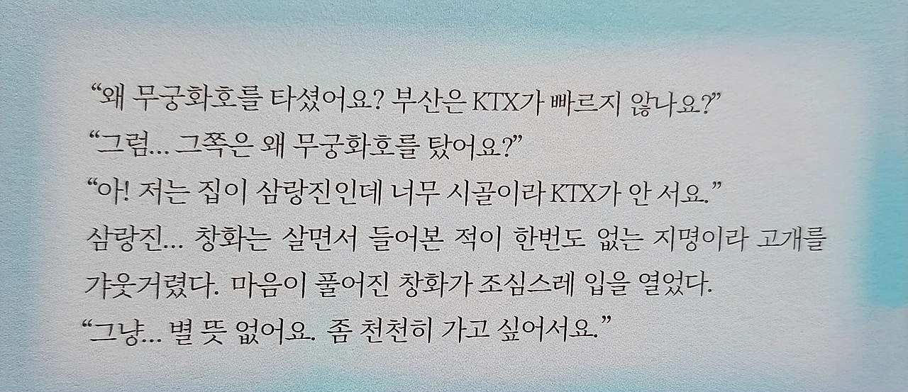 삶의 속도를 늦추고, 멈춤 속에서 자신을 돌아보는 치유와 회복을 담은 이 작품은 빠르게 돌아가는 도시의 삶 속에서 무작정 기차에 오르는 주인공들을 보면서, 멈출 수 있는 용기가 필요하다는 것을 깨닫게 되고, 야경은 그 속에 있을 땐 아름다움을 알 수 없지만, 거리를 두고 보면 진가를 알 수 있는 것처럼, 적절한 거리에서 자신과 타인을 바라보는 것도 중요하다라는 것을 일깨워준다. KTX도 서지 않는 작은 시골역 삼랑진! 이곳은 지친 마음이 머무는 치유의 공간으로 작은 공간에서 주는 위로가 좋다.우리는 원치 않는 인생이 반복될 때 고민하게 된다. 사는 게 외롭고 힘든데 이유를 모르겠고, 쉴 새 없이 돌아가는 쳇바퀴 같은 하루하루에 지쳐갈 때 우리는 "나는 누구고, 여긴 어디지?" 하고 생각하게 된다. 만약 여기서 멈추었을 때, 과연 어떤 일이 일어날까? 우리는 멈추는 법을 잘 모른다. 쳇바퀴를 벗어나면 인생이 망할 거라고 생각하기 떄문이다. 그러고 같은 하루가 또 반복되는 인생에 살고 있다. 이 작품의 주인공인 창화와 미정은 각자의 이유로 다니던 직장을 그만두고 고향으로 내려가기 위해 무궁화호 기차에 오르게 된다. 우연히 옆자리에 앉게 된 두 사람에겐 공통점이 있다. 바로 멍해지는 시선, 움찔하게 만드는 핸드폰 벨소리, 어딘가로 떠나는 짐가방, 혼자이고 싶지만 또 혼자이고 싶지 않은 옆사람에 대한 일말의 호기심이다.