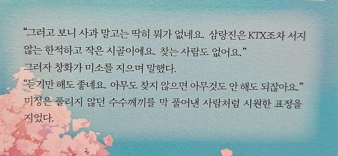 기차는 멈췄고, 나는 남았다! <내리실 역은 삼랑진역입니다>는 대도시의 경쟁에 지친 청춘들이 무궁화호에서 만나는 따뜻한 위로와 치유의 이야기로, 저자의 섬세한 문장이 돋보이는 작품이다. 제11회 교보문고 스토리대상 최종심 선정작인 이 작품은 삼랑진역을 배경으로 하여, 치유와 전환의 공간으로 그려진다. 주인공인 창화와 미정의 중심으로 그려낸 이 작품은 두 사람의 감정을 마법같은 이야기로 그려냈다. 바쁜 일상 속에서 잠시 멈춰 서고 싶은 이들에게 조용한 위로를 느끼게 하는 작품으로, 삼랑진이라는 공간에서 벌어지는 이야기이다. 삼랑진은 밀양시에 작은 마을로, KTX도 서지 않는 작은 시골역이다. 하지만 그 고요함을 인물들의 내면을 비추는 거울 같은 작품이다. 이 작품에는 많은 인물들이 나오지는 않는다. 하지만 각 인물들의 감정선을 깊이 있게 그려내어, 큰 울림을 느끼게 한다. 삶에 지친 이들에게 잠시 멈춤의 용기를 건네는 힐링 소설! 천천히 달리는 무궁화호처럼 천천히 마음을 풀어주는 이 작품은 도시의 빠른 리듬에 지친 청춘들이 무궁화호를 타고 삼랑진역에 도착하면서 벌어지는 이야기를 담았다. 주인공 창화와 미정은 각자의 사연을 안고 기차에 오르며, 낯선 간이역에서 서로의 마음을 알아간다. 창화는 부산에서 내릴 예정이었다. 하지만 삼랑진역에서 미정과의 대화를 통해 삶의 방향을 다시 고민하게 된다. 미정은 삼랑진역에서 내릴 예정이었다. 하지만 창화와의 만남을 통해 자신의 상처를 마주하고 치유받는다. 자신의 삶도 잠시 멈춰보고 싶은 마음이 드는 이 작품은 빠르게 흘러가는 도시 속에서 잠시 멈추는 것도 좋은 의미를 담고 있다.