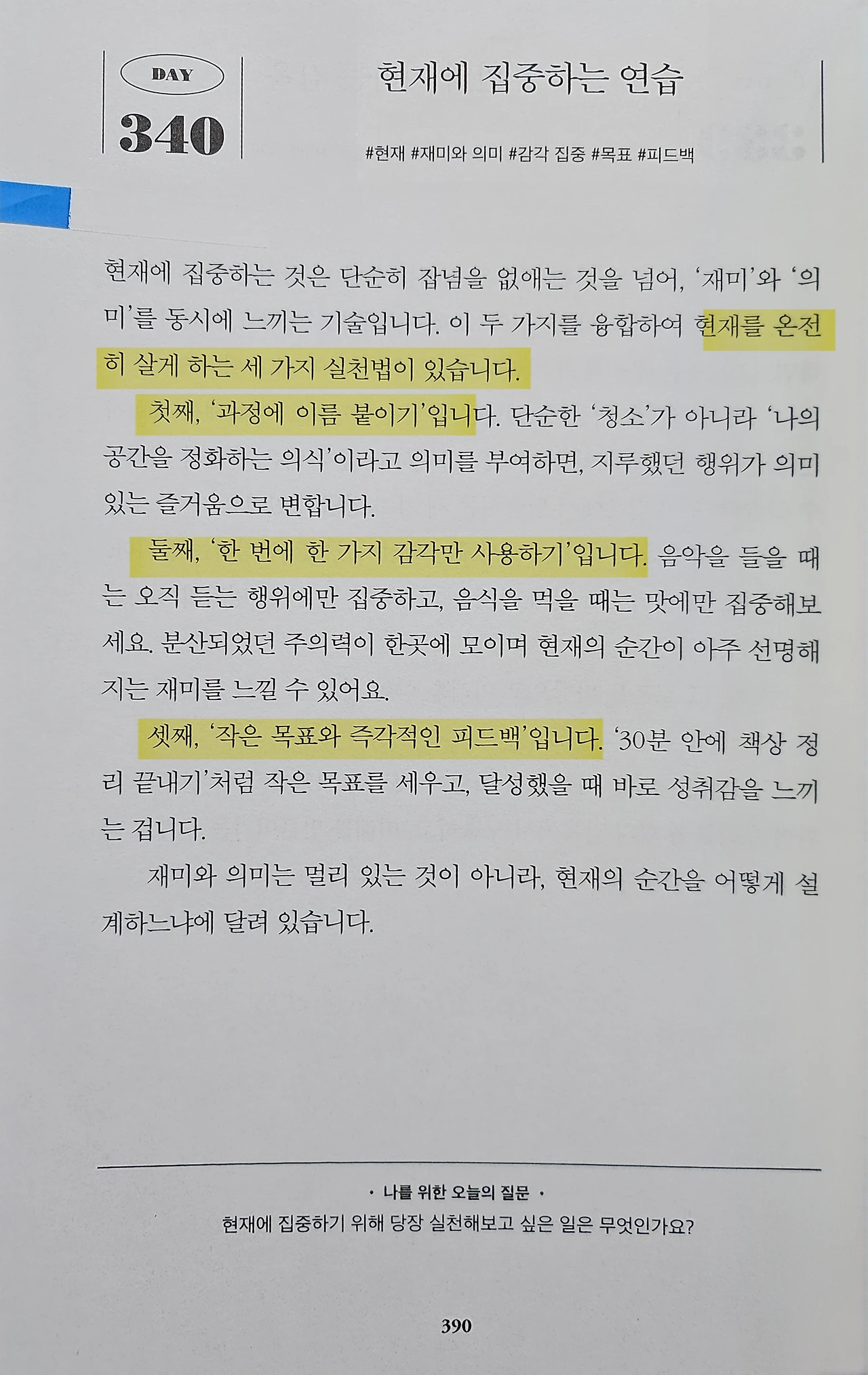 빠른 세상 속에서 잠시 멈춰, 생각의 속도를 조절하는 법을 알려주는 작품! 속도를 늦추면 보이는 것, 모든 존재를 환대하는 법, 일상에서 풍요 찾는 법 등을 다루고 있는 이 작품은 복잡한 하루를 정리하고, 나다운 삶의 리듬을 찾게 해준다. 누구나 자신의 일상에서 적용할 수 있도록 하는 이 작품은 마음이 가벼워지고, 단 5분의 사유가 하루 전체의 방향을 바꾸는 것처럼, 속도보다 방향을 회복할 수 있게 해주는 작품이다. 작은 습관이 쌓여 큰 변화를 만드는 것처럼! 이 작품은 실천적으로 보여주는 작품이다. 바쁜 일상 속에서도 짧은 글과 기록으로 자기 성찰과 성장의 루틴을 만들 수 있다는 것을 보여주는 이 작품은 자기계발서에 지친 사람에게는 인문학적 질문과 기록을 통해 새로운 접근을 제공한다. 꾸준함을 통해 새로운 삶을 바꾸고 싶은 사람이 읽으면 아주 좋은 인문학이다.하루 한 장씩 읽고 기록하는 작은 실천은 장기적으로 큰 변화를 만들고, 저자가 대한민국 1호 기록학자라서 그런지 개인의 기록이 자기 성찰과 성장의 도구를 강조한다. 1년 동안 매일 한 장씩 읽고 질문에 답하는 구조로 되어 있는 이 작품은 꾸준히 책 읽는데에 부담이 있는 사람이라면 하루 5분만 투자하면 부담없이 읽을 수 있는 작품이다. 성장, 습관, 마음관리, 인간관계 등 일상과 밀접한 이야기를 다루고 있는 작품이니, 꼭 한번 읽어보길! 매일 한장씩 읽으면 자기만의 습관을 만들 수 있을 것이다.