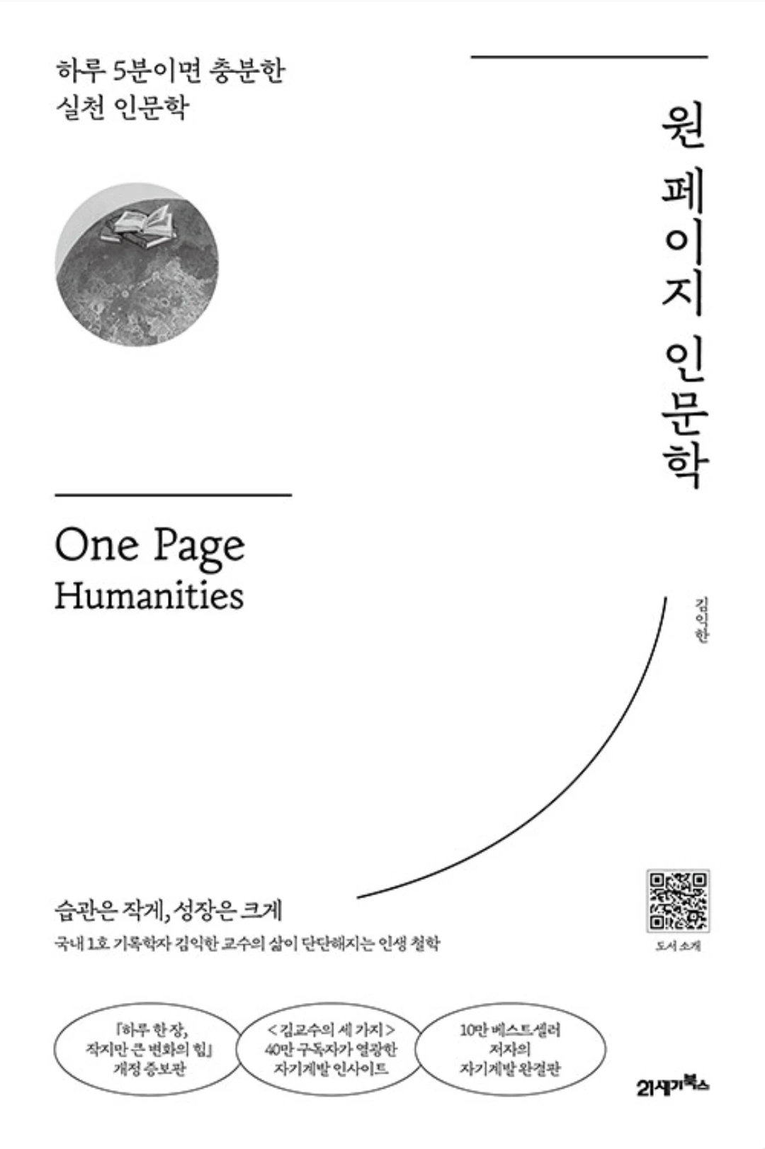 <하루 한장, 작지만 큰 변화의 힘>의 철학을 오늘의 생활 리듬에 맞게 개정 증보한 실천 교양서! <원 페이지 인문학>은 국내 1호 기록학자인 김익한 교수가 아는 것이 아니라 사는 것을 제안하는 365일 인문학 교양서로, '읽고, 사유하고, 기록하고, 살아간다' 를 12개의 자기 계발 주제로 구분해 놓은 작품으로, 하루에 한 페이지씩 5분만 투자하면 읽을 수 있는 작품이다. 누군가에는 아침 루틴으로, 또 누군가에는 점심의 5분 리셋으로, 또 누군가에는 잠들기 전 하루를 정리하는 도구로 활용되는 이 작품은 짧은 문장과 간결한 호흡을 담은 작품으로, 머리로만 배우는 인문학이 아니라, 일상을 더 단단하게 하는 인문학이다. 30~40대 필사, 인문, 루틴까지! 세대를 아우르는 이 작품은 자기 성장과 습관 형성을 돕는 실천형 인문학이다. 하루 한장씩 읽을 수 있도록 구성된 이 작품은 365개의 짧은 글과 질문으로 되어 있다. 또한 단순히 지식을 전달하는 것 뿐만 아니라 매일 오늘의 질문도 함께 들어있어서 직접 생각하게 한다. 이전 저서에서 더 보완한 이 작품은 인문학에 막 입문한 사람, 혹은 매일 똑같은 자기계발서가 싫은 사람이랴면 , 충분히 공감할 만한 문장들이 많아 꾸준히 읽기 어려운 사람들에게 딱 맞는 작품이다.