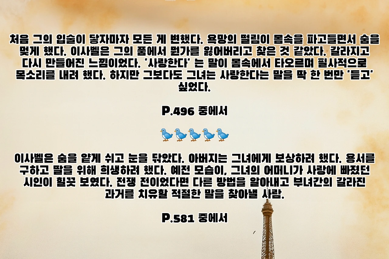 전쟁이라는 극한 상황 속에서 여성들이 겪는 고난과 저항을 섬세하게 그려냈고, 잃어버린 시대의 낭만과 비극을 함께 그려낸 이 작품은 역사의 뒤안길에 숨겨져 있던 여성들이 감당해야 했던 고통, 그리고 그 속에서 피어난 강인함을 재조명한 작품으로, 여성들이 단지 생존자가 아니라 저항자인 동시에 구원자로서 그려냈다. 누구의 아내이자 딸이었을, 어머니로서의 역할만 한게 아니라, 독립적이고 주체적인 한 인간으로서의 여성을 당당하게 그려낸 작품! 읽는내내 인물들의 감정이 그대로 느껴져서 몰입도가 엄청 높은 작품으로, 역사 소설의 무게감과 드라마의 감정선을 완벽하게 조화를 이룬 작품이다. 이 작품은 단순히 슬픈 이야기가 아니라, 용기가 무엇인지, 사랑은 어떻게 살마을 버티게 하는지, 희생의 의미는 무엇인지를 깊이 있게 생각해보게 하는 작품으로, 읽고 나면 오랫동안 여운이 남는 작품이다. 전쟁 속에서도 인간이 얼마나 강하고 아름다울 수 있는지를 보여주는 작품이니, 꼭 한번 읽어보길! 읽다보면 마음을 오랫동안 붙잡을 만한 소설을 만날 수 있을 것이다.