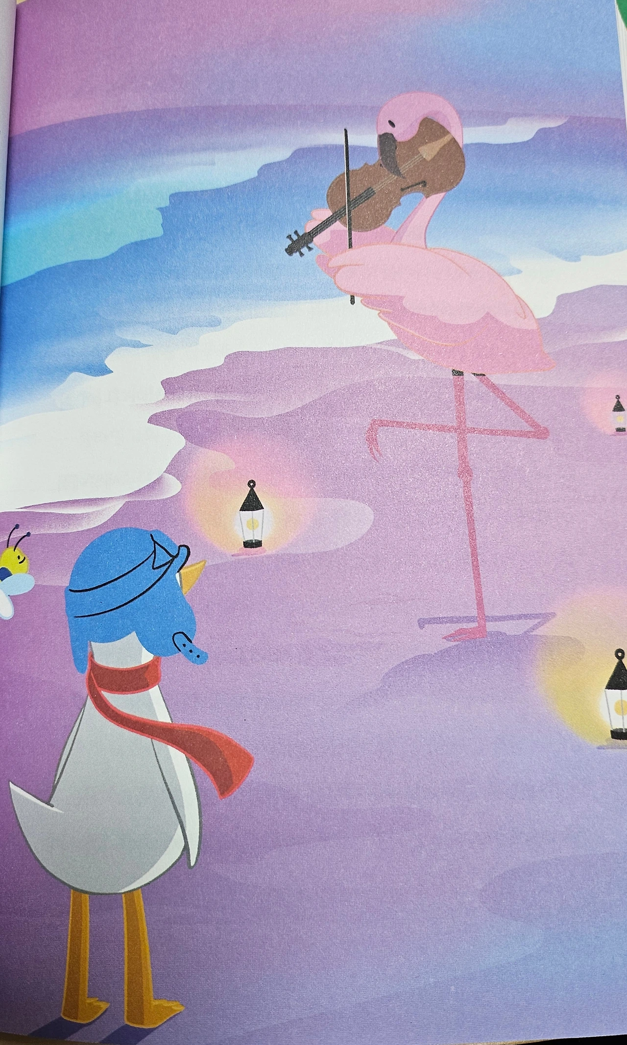 문득 깨달았지! 내 삶이 매일 바다를 날아다니며 여행하는 엄청난 삶이란 걸! 바다는 하늘보다 훨씬 넓고, 깊고, 아름다운 걸 깨달는 순간이 내 화려한 꿈이 이루어지는 순간이었단다. 바다는 어찌나 깊은지 몰라. 아주 깊숙한 곳까지 닿았다가 다시 해수면 위로 오를 때면, 하늘보다 더 높이 날아오르는 느낌이지!. 새들이 닿을 수 없는 바닷속 깊은 곳의 이 화려한 아름다움을 내가 볼 수 있다니! 그래, 나는 매일 바다를 비행하고 있어! 하늘보다 더 높이!