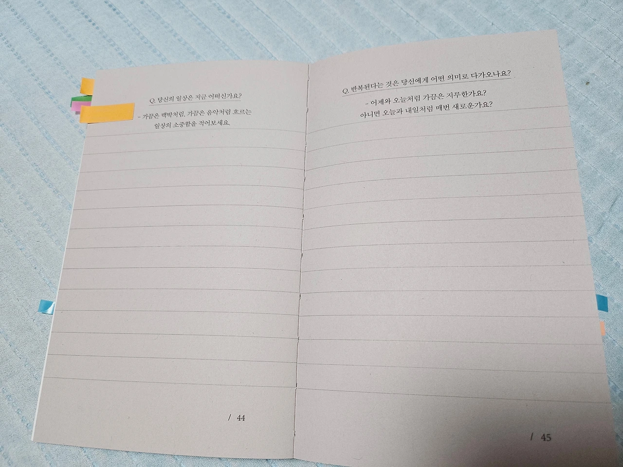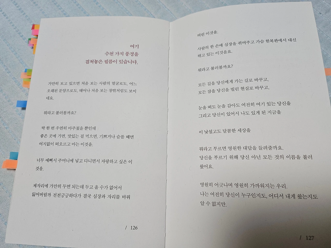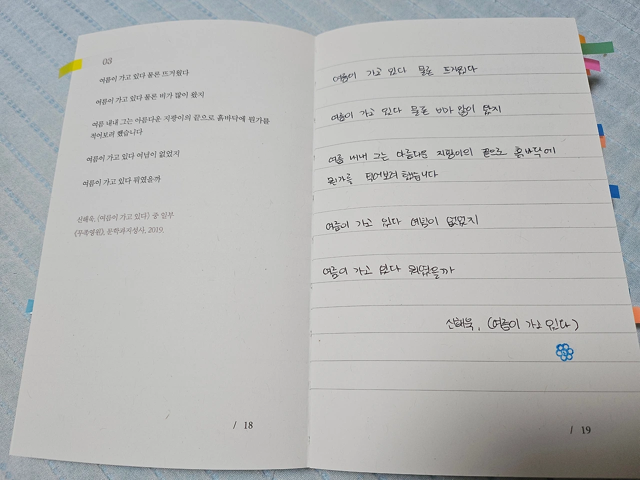 오래 묵혀둔 감정에 조용히 말을 건네는 듯한 이 작품은 79편의 시를 손끝으로 천천히 따라 쓰다 보면, 내 마음에 꾹꾹 담아뒀던 감정을 조금씩 세상 밖으로 나오는 듯한 느낌을 준다. 또 한 줄 한 줄 적어내려갈때에는 마음의 작은 방들이 하나씩 열리는 듯한 느낌과 어둑했던 곳에서 빛이 서서히 번져오는 듯한 느낌을 동시에 느낄 수 있었던 필사집이었다. 우리는 필사를 통해 마음 속에 숨겨왔던 감정들을 찾아낼 수 있고, 쉽게 꺼내지 못했던 마음 안의 이야기를 정돈할 수 있어서, 필사는 소란스러운 일상 속에 갇혀 있던 마음을 열게 해주는 경험을 하게 된다. 이 작품은 그런 일상의 무게를 부드럽게 열어주고, 지친 마음을 다시 환한 빛으로 나아갈 수 있도록 해주는 작품이다. 필사를 통해 우리는 자기 성찰과 치유를 돕는다. 그래서 우리는 필사를 한다. 필사는 단순히 시를 베끼는게 아니다. 필사하면서 쓰는 과정을 통해 우리는 복잡했던 마음을 정리하게 되는 계기가 되고, 내면을 돌아보게 하는 계기가 된다. 필사를 통해 우리는 자신의 감정을 차분하게 만들어내고, 마음의 속도를 되찾는 경험을 하게 한다. 그래서 시를 잘 몰라도 괜찮다라는 마음이 들게 하는 점에서 편안한 독서 경험을 하게 하는게 바로 '필사' 가 아닐까 싶다.