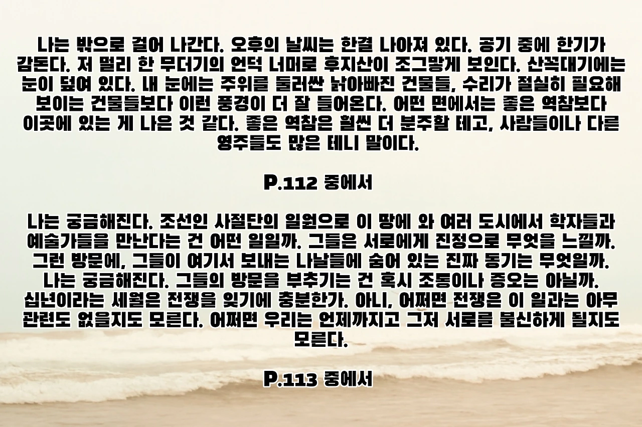 이 작품은 단순한 이주 서사를 그려냈다기보다는, 인간 존재의 근원적 질문을 담고 있어서 조용하지만 강력한 울림을 남기는 작품이다. 디아스포라적 삶, 상실과 회복, 인간 존재의 존엄성, 그리고 연결에 대한 갈망을 그린 이 작품은 다양한 시공간을 통해 이주와 분단, 전쟁과 유배 속에서도 인간이 지닌 기억과 관계의 흔적을 그려냈다. 전쟁, 분단, 유배 , 이주로 인해 가족과 공동체를 잃은 사람들! 이들을 단순히 상실을 그려낸 게 아니라, 상실 이후에도 남아 있는 인간의 존엄성과 회복을 그려냈다는 점에서 이 작품은 모든 단편들이 빠짐없이 좋은 작품들이다. 우리 모두가 어떤 의미에서는 이주민이라는 사실을 환기하고 있다. 물리적 이동뿐만 아니라 삶의 전환과 변화 속에서 우리는 늘 떠나고 도착하는 존재라는 것을 이 작품을 통해서 깨닫게 된다. 떠남과 상실 속에서도 인간이 지닌 존엄성과 관계의 흔적을 그린 단편집! 이주 경험이 없는 이에게도 충분히 공감과 사유를 느끼게 하는 작품으로, 모든 현대인의 삶과 맞닿아 있는 작품이니, 꼭 한번 읽어보길! 독서의 의미와 가치를 새롭게 느끼게 될 것이다.