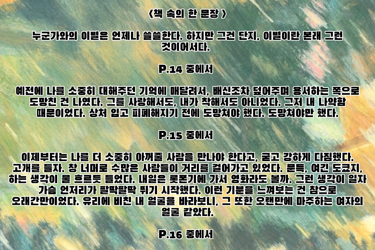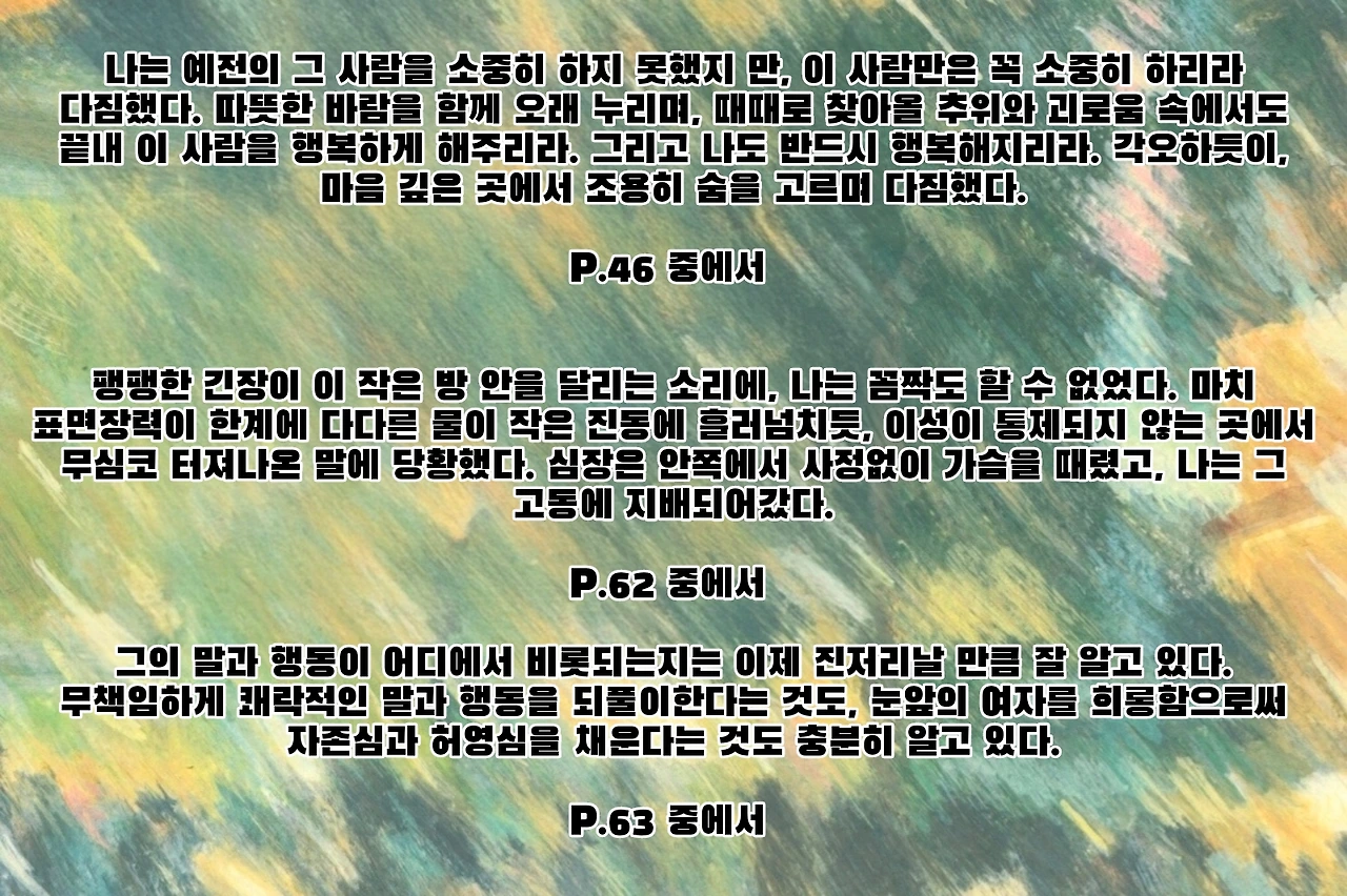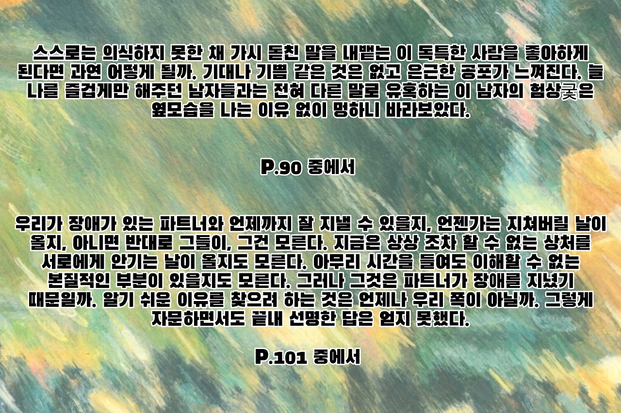 짤막하게 엮어낸 우둔한 사람들의 우둔한 말과 행동을 되풀이하는 우둔한 이야기인 이 작품은 우리 삶에서 완벽히 빛나야만 하는 가치, 즉 소중한 사랑의 순간이 지나는 의미를 곱씹게 하는 작품으로, 묘한 매력이 있는 작품이다. 이 작품의 제목처럼, 닿지 못했기에 닳아버린 감정들, 그리고 전하지 못한 말들이 남아 마음 속에서 계속 마찰을 일으키는 상태는 결국 사랑은 완벽하지 않다는 것, 그 불완전함 속에서 인간적인 진실을 그려낸 작품이다.작은 순간들로 사랑의 본질을 그린 작품! 현실적이고 때로는 찌질해 보일 수 있는 사랑의 모습을 사랑의 진실에 가까워질 수 있다는 것을 보여줌으로써, 오래 마음에 남는 울림을 느끼게 하는 작품이었다. 사랑이란 현명함보다 때로는 어리석을 수 있다는 것을 보여주는 작품! 완성되지 못한 사랑, 전하지 못한 말, 닿지 못한 마음을 애틋하게 그려낸 작품으로, 일상의 작은 순간들을 통해 사랑의 불완전성과 그로 인한 인간적인 진실을 잘 보여주는 작품이다. 사소하다고 여겨지는 순간들! 오히려 사랑의 본질을 그려낸 작품! 18편의 짧은 이야기가 부담 없이 읽을 수 있는 작품이지만, 오랫동안 여운이 남는 작품으로, 한 편 한 편이 일상을 보는 듯하여, 감정이 진지하게 다가오고, 묵직하게 느껴졌던 작품이었다. 유명 작가들이 추천한 작품으로 문학적 신뢰도가 높은 작품이니, 꼭 한번 읽어보길! 사랑이란 감정의 불완전성과 인간적인 진실을 생각하게 만들 것이다.