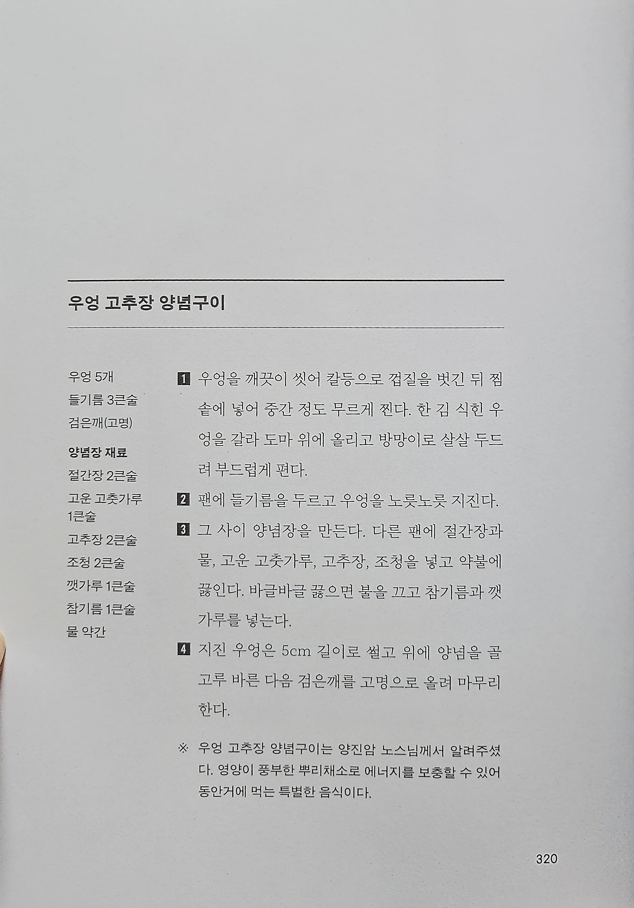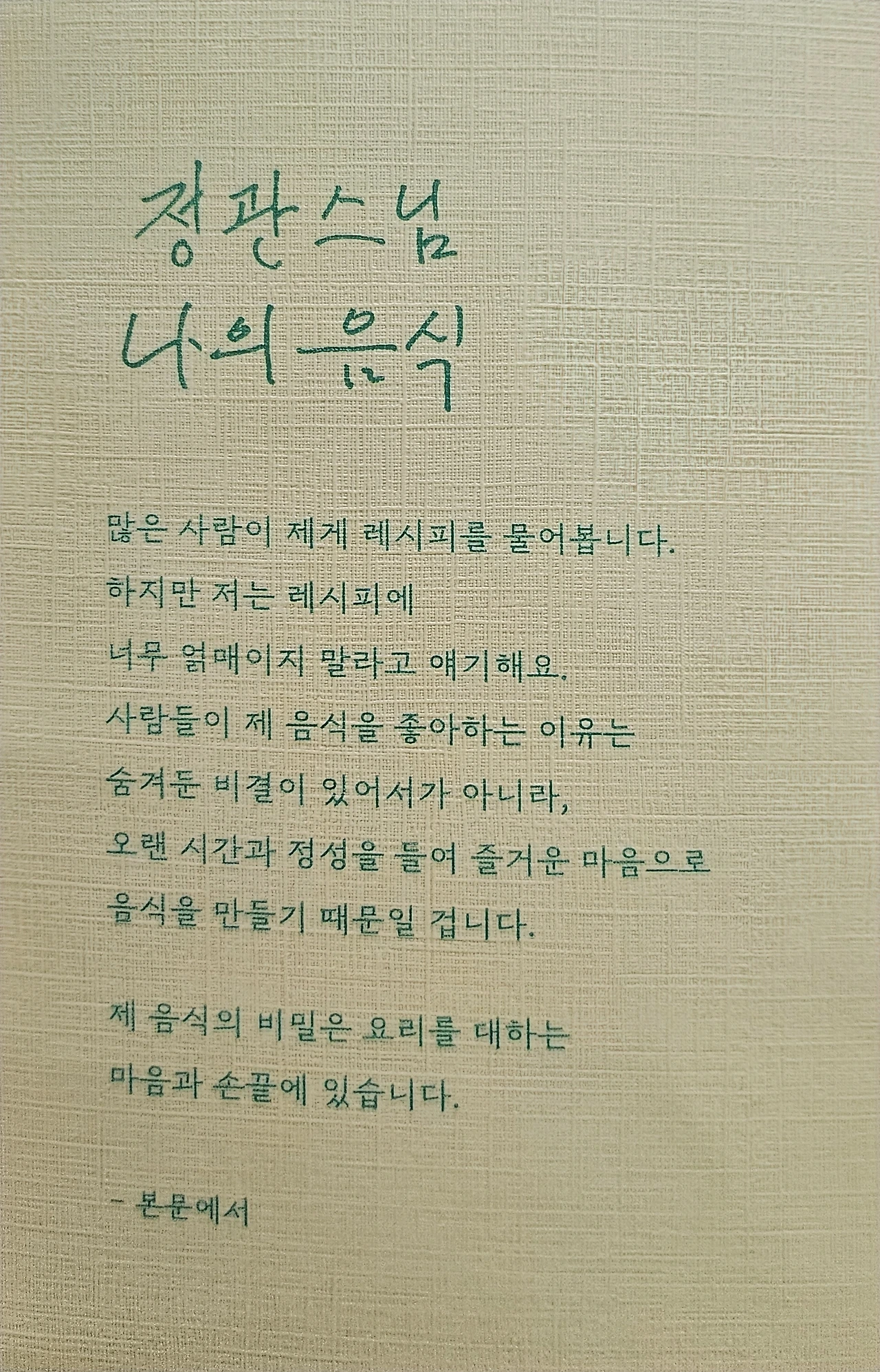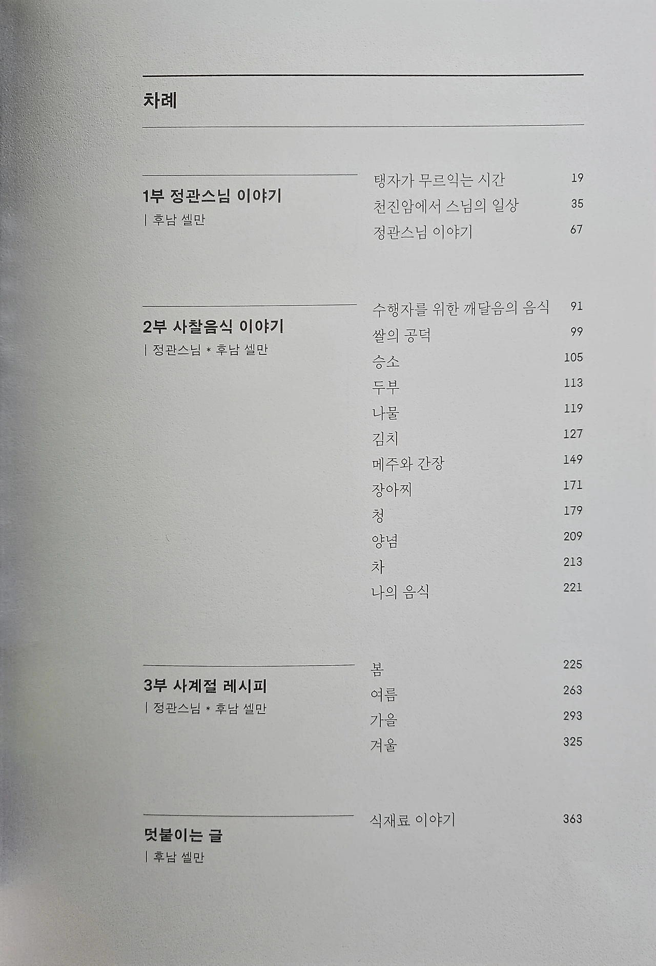 누구나 건강한 음식으로 좋은 삶을 살아가길 바라는 마음으로 이 책을 펴냈다고 하는 이 작품은 곧 KBS와 넷플릭스에서 공개될 다큐멘터리 <철학자의 셰프>와 웨이브 <공양간의 셰프들>에서도 음식을 대하는 삶의 태도를 전할 예정이기도 하다. 한 그릇의 음식에 담긴 지혜와 사계절을 따라 정성껏 정리한 레시피 58편과 아름다운 풍경 사진을 함께 수록된 이 작품은 도란도란 이야기를 건네듯이, 먹는 일상이 어떻게 몸과 마음을 돌보는 삶으로 이어질 수 있는지를 담아낸 작품이다. 정관 스님의 한땀 한땀 정리한 58개 사계절 레시피와 사찰음식은 몸에 좋지만 맛은 심심할 것이라는 고정관념을 완전히 깨트린 이 작품은 요리법을 배우는 요리책이 아니라, 음식을 통해 삶을 성찰하고 수행을 실천하는 길을 보여주는 작품으로, 한 그릇의 밥이 몸과 마음을 돌보는 방식으로 이어지는 과정을 담은 작품으로, 단순히 요리 레시피로 보면 안되는 작품이다.