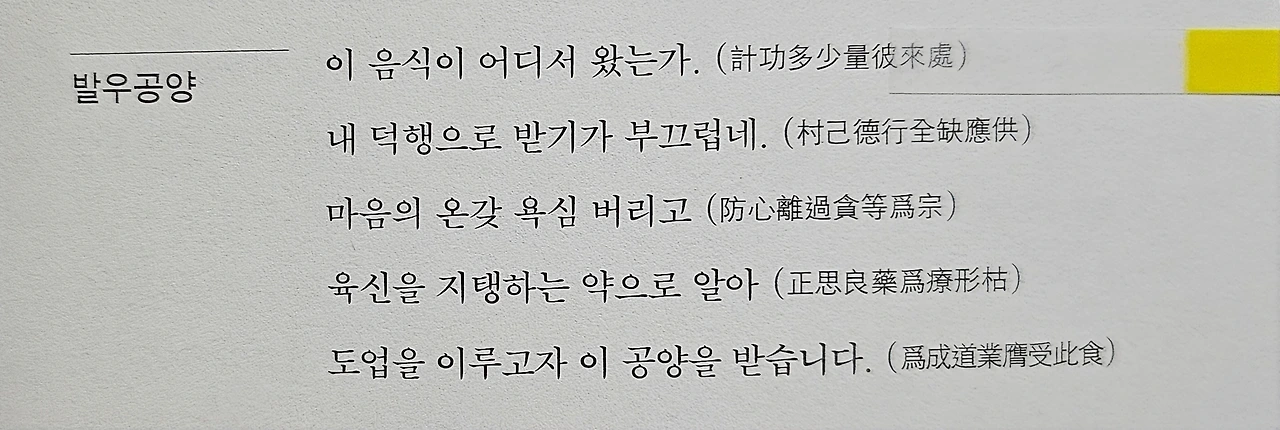 사찰음식은 자연과 인간, 그리고 모든 중생이 더불어 살아가는 존재임을 깨닫게 하는 수행의 방편이기도 하다. 승려로서 음식을 먹는 이유는 생명을 이어가고 수행할 수 있는 에너지를 얻기 위해서다. 나머지는 모두 탐욕이다. 그래서 불교 수행자는 발우공양을 한다. 먹을 것을 절제하는 수행을 통해 욕심부리지 않는 법을 배우는 것이다.