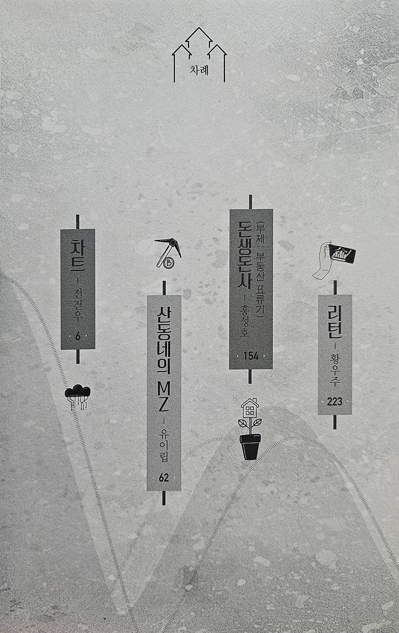욕망과 불안의 그래프! <차트>는 2030 청년세대의 불안과 절박함을 그린 앤솔로지 소설집으로, 차트 밖으로 밀려난 일상과 존엄의 이야기이다. 오늘날 한국 사회를 관통하는 '돈' 을 주제로 한 이 작품은 주식, 가상화페, 재개발 부동산 등 2030 세대가 마주한 경제적 절벽과 그로 인한 도덕적 붕괴를 하이퍼리얼리즘 문체로 그린 작품으로, 아주 날카롭게 그려냈다. 이 작품에는 총 4편의 이야기가 수록되어 있다. 4편의 이야기 전부가 단순히 부자가 되고 싶은 욕망을 넘어, 왜 이 시대의 청년들이 비현실적으로 자신들의 소중한 일상을 걸 수 밖에 없는지를 그린 작품으로, 주식 차트의 하락 곡선처럼 곤두박질치는 인간의 존엄성과 지금 우리가 살고 있는 이 사회의 시스템이 과연 안전한지를 보여주는 작품이다. 현재의 불안을 소름 끼치도록 생생하게 그린 이 작품은 현대인의 가장 내밀한 욕망인 '부' 가 어떻게 한 개인의 삶을 파괴하는지, 그리고 괴물이 되어가는지를 잘 보여주고 있다. 4편의 주인공들은 우리가 흔히 말하는 MZ 세대들이다. 누군가는 백만 유튜버로 성공을 맛보고, 누군가는 열약한 재개발 현장에서 밤을 새우고, 누군가는 내 집 마련의 꿈을 쫓는 이들이다. 그러나 이 작품이 말하고 있는 주제가 공통점으로 돈이다. 돈이라는 보이지 않는 줄에 묶여 춤추는 꼭두각시처럼, 숨통을 조여오는 서스펜스와 현실보다 더 현실 같은 이야기로 한 편의 드라마를 보는 듯하다.