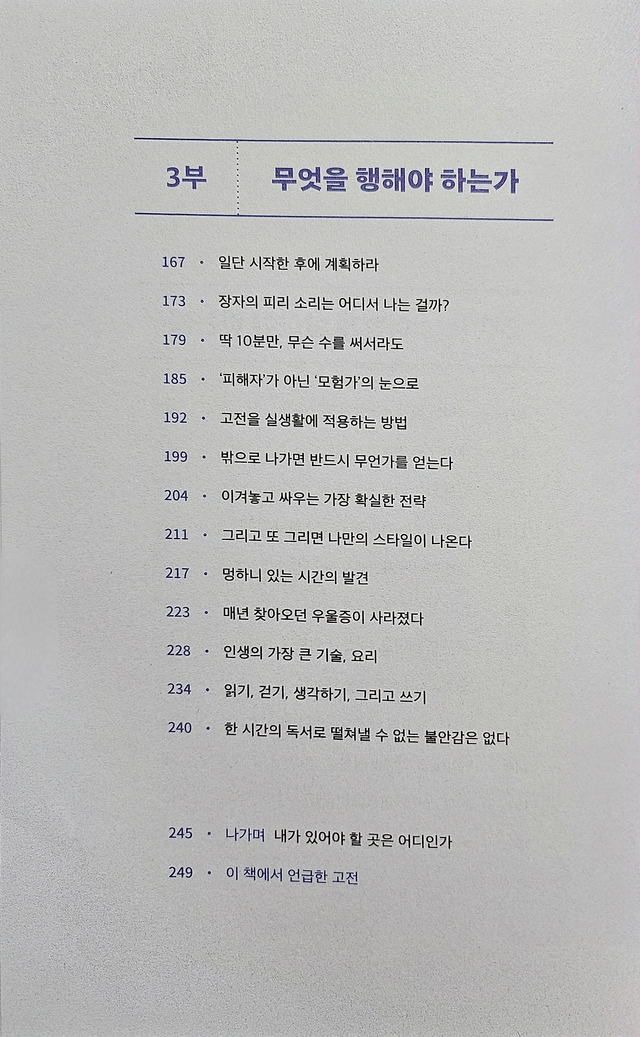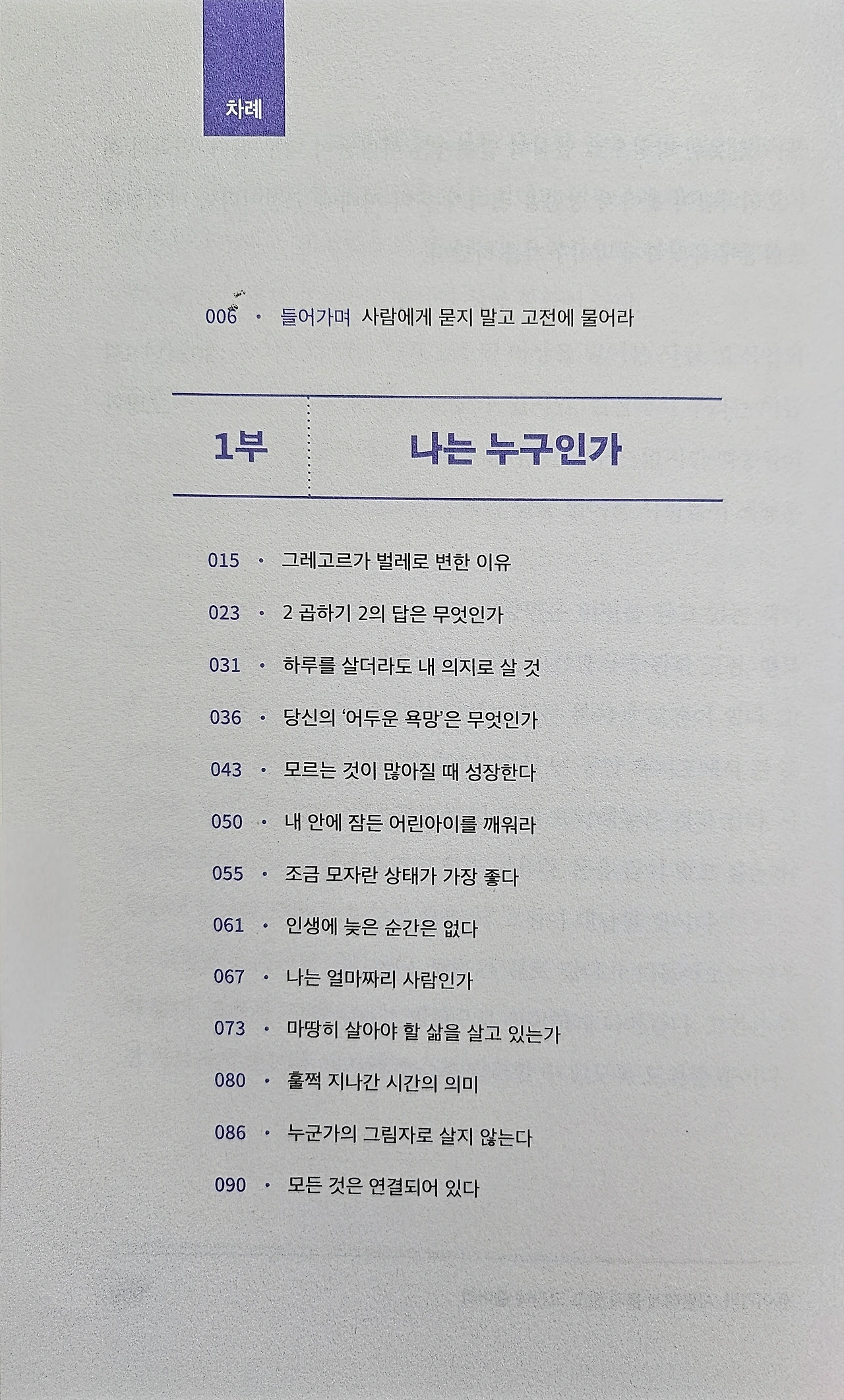 카프카, 장자, 다양한 고전 속에서 현대인의 삶을 적용할 수 있는 교훈을 제시하고, 실제로 저자가 시한부 선고를 받은 경험 토대로 죽음을 직면하고 삶의 의미를 다시 묻고 답을 찾는 과정을 담아낸 이 작품은 총 3장으로 구성된다. 1장에서는 자기 정체성, 과거와의 화해, 존재의 의미를 다루고, 2장에서는 고통과 행복의 균형, 타인을 위한 삶, 소유와 집착의 문제를 다룬다. 마지막 3장에서는 실천의 중요성, 실패와 도전, 고전을 삶에 적용할 수 있는 방법을 제시한다. 단순히 성공이나 부를 이야기하는 작품이 아니라, 이 작품은 삶의 본질과 방향을 대해 이야기한다. 고전을 단순히 인용했을 뿐만 아니라 현대인의 삶에 어떻게 적용할 수 있는지를 제시하는 작품이기도 하다. 단순한 위로를 주는게 아니라, 삶을 새롭게 바라보게 하는 이 작품은 고전에서 찾은 답을 알려주는 작품으로, 미래에 대한 불안, 타인과의 끊임없는 비교, 자기착취와 번아웃의 굴레에서 벗어나 도전과 설레임, 만족과 행복으로 삶의 방향을 바꿀 수 있게 해주는 작품이다.