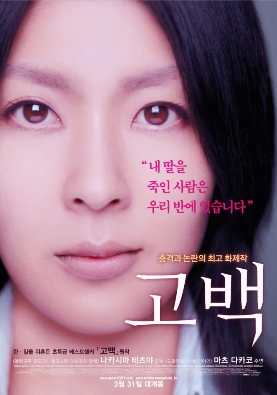 *줄거리 : 자신이 근무하는 학교에서 어린 딸을 잃은 여교사 유코, 봄방학을 앞둔 종업식날, 그녀는 학생들 앞에서 차분하게 목소리를 입을 열기 시작한다. " 내 딸을 죽인 사람은 우리 반에 있습니다." 라는 충격적인 고백와 함께... 형사적 처벌 대상이 아닌 13살 중학생들이 벌인 계획적인 살인사건, 그녀는 범인들에게 가혹한 복수를 실행하게 된다.