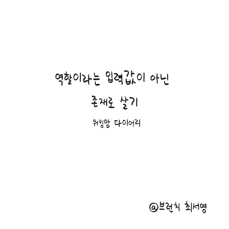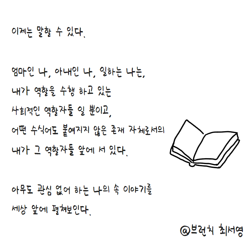 그렇게 눌러 담은 것들은 머지않아 새어 나오기 마련이고, 나는 머지않아 일과 육아를 일직선상에 두고 있는 이 구도 자체가 잘못된 접근이었음을 알게 되었다. 엄마인 나, 아내인 나, 일하는 나는, 내가 역할을 수행 하고 있는 사회적인 역할자들 일 뿐이고, 어떤 수식어도 붙여지지 않은 존재 자체로서의 내가 그 역할자들 앞에 서 있어야 한다.