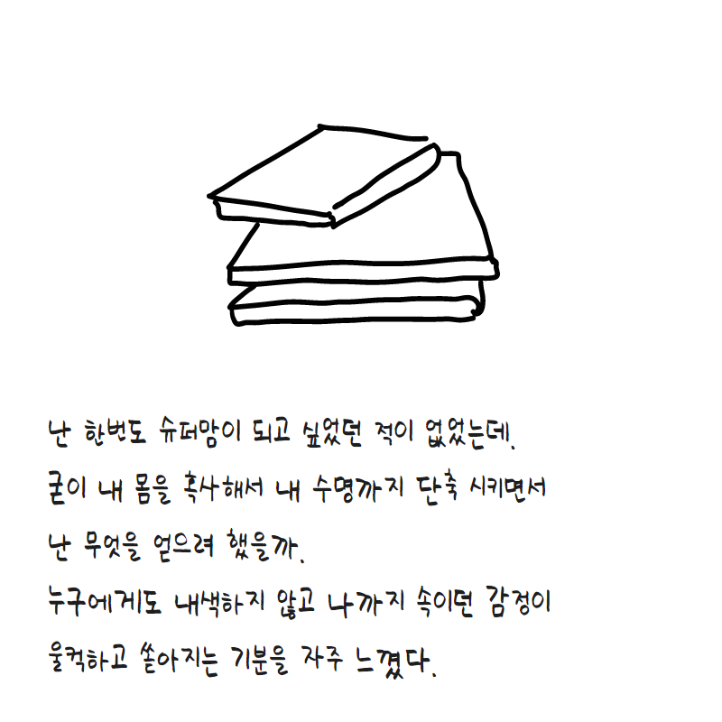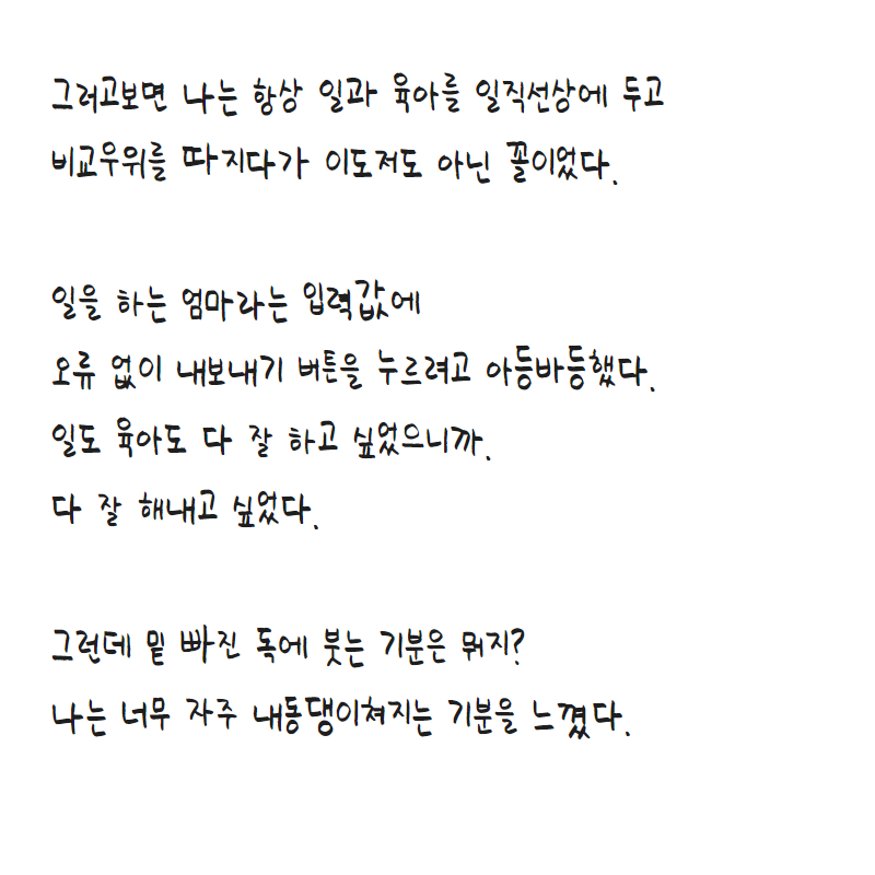워킹맘이라는 게, 얻는 건 오로지 ‘나의 일’ 뿐이라고 생각했다. 난 한번도 슈퍼맘이 되고 싶었던 적이 없는데, 굳이 내 몸을 혹사해서 인생 야무지게 살고 싶은 기분을 얻고 싶은걸까. 내 몸과 내 수명까지 단축 시키면서, 굳이 스트레스를 받으면 내 인생만 힘든거지 그렇게 얻는 게 도대체 뭘까? 아이를 낳고 한 1년을 그렇게 살았다. 누구에게도 내색하지 않고 꾹 내 속 어딘가에 눌러 담으며 말이다.