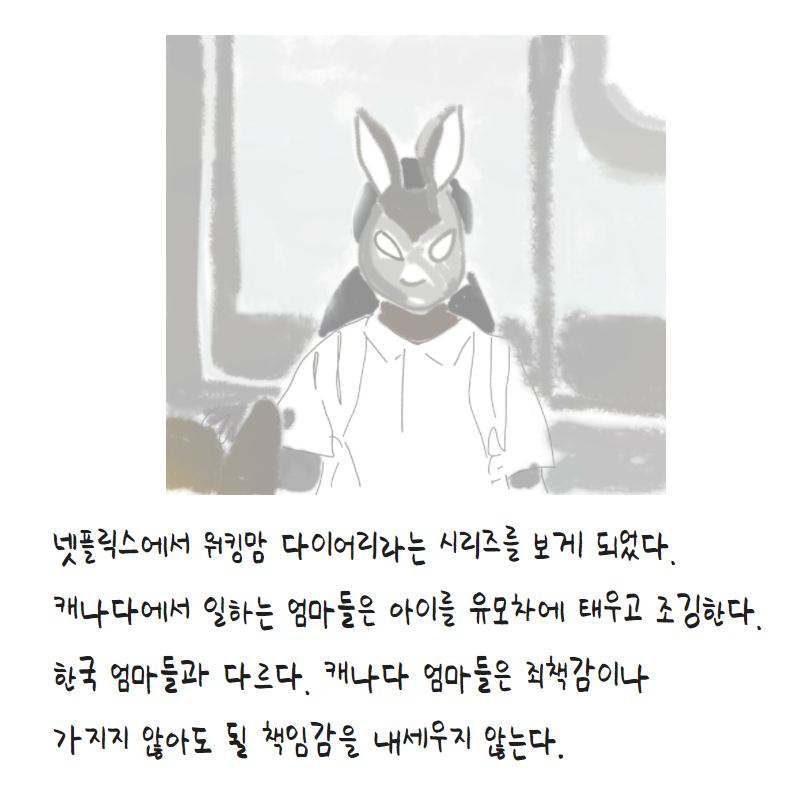 넷플릭스를 보다가 워킹맘 다이어리라는 시리즈를 보게 되었다. 캐나다에서 일하는 엄마들의 이야기를 담는데, 첫 화부터 한국 엄마들과는 다른 정서와 문화를 보여준다. 이를테면, 아이를 유모차에 태우고 조깅을 하는 모습. 그녀들에겐 엄마로서의 죄책감 같은 건 전혀 없어 보였다. 저런 건강함은 도대체 어떻게 만들 수 있는걸까?