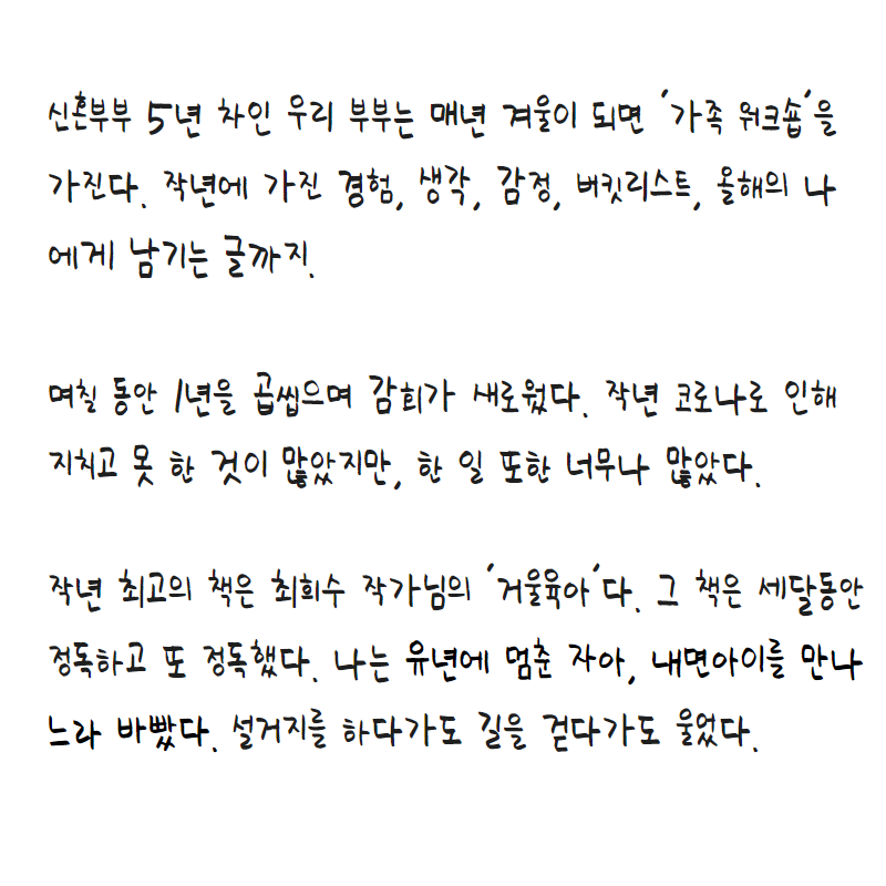 신혼부부 4년 차인 우리 부부는 매년 겨울이 되면 ‘가족 워크숍’을 가진다. 올해도 역시 가족 워크숍을 열었다. 작년에는 조아가 어리다는 이유로, 올해는 코로나를 이유로 집에서 워크숍을 가졌다.