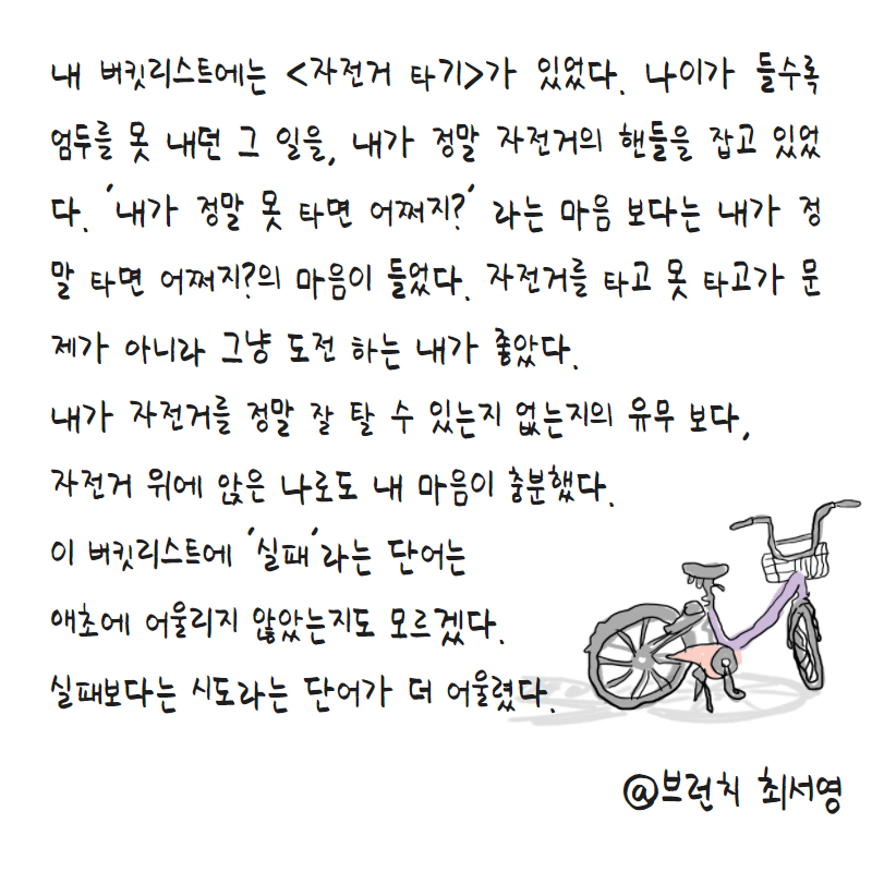 하지만 올해 자전거 타기는 실패했다. 내가 자전거를 정말 잘 탈 수 있는지 없는지의 유무 보다, 자전거 위에 앉은 나로도 내 마음이 충분했다. 이 버킷리스트에 ‘실패’라는 단어는 애초에 어울리지 않았는지도 모르겠다. 실패보다는 시도라는 단어가 더 어울렸다.