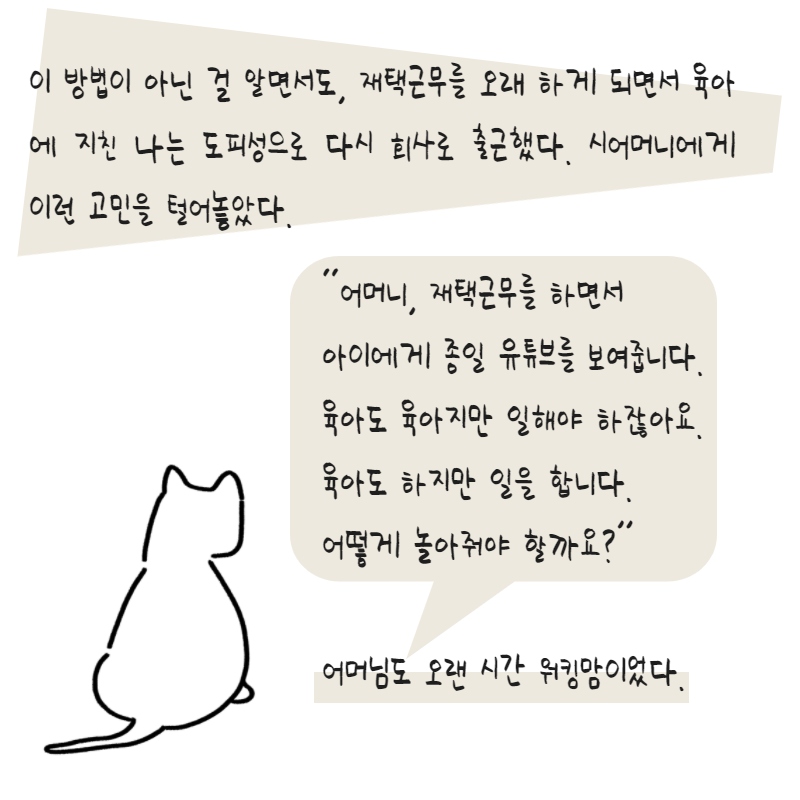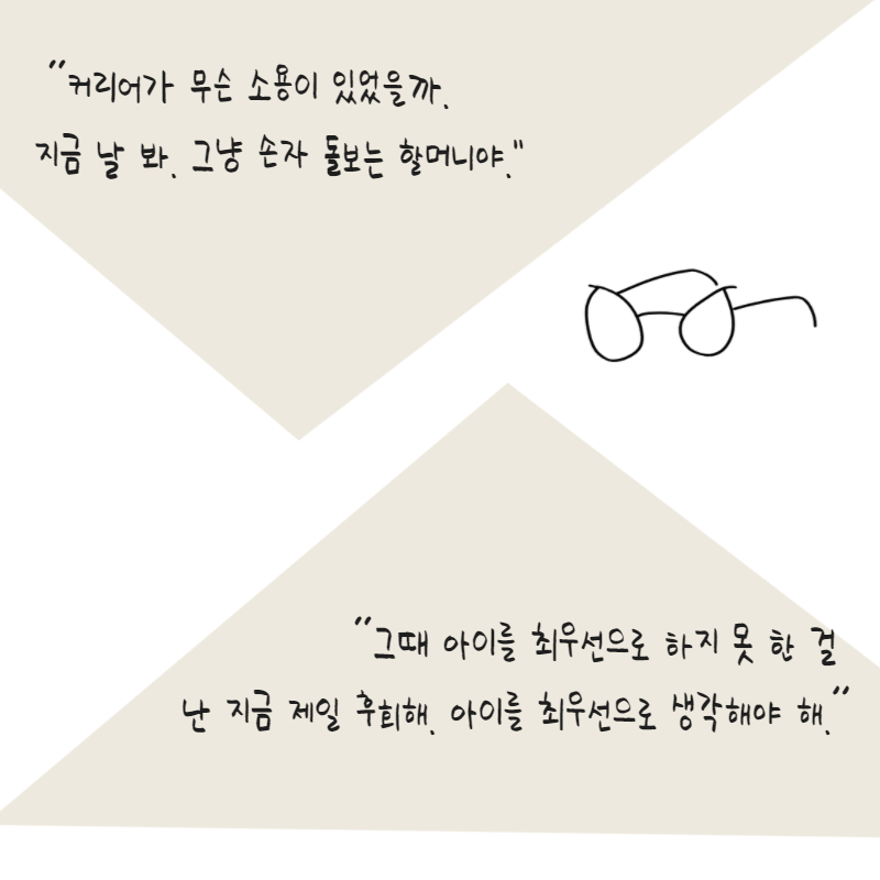 나는 공적자아를 해내는 데 너무나 지쳐버렸다. 이 방법이 아닌 걸 알면서도, 재택근무를 오래 하게 되면서 아이를 방치하고 있다는 죄책감을 벗어나기 위해 도피성으로 다시 회사로 출근했다. 시어머니에게 이런 고민을 털어놓았다. “어머니, 재택근무를 하면서 아이에게 종일 유튜브를 보여줍니다. 육아도 육아지만 일해야 하잖아요. 육아도 하지만 일을 합니다. 그런데 육아도 잘 해내지 않고 그렇다고 일을 잘 해내는 건 또 아닙니다. 촉감놀이도 하루 이틀이고, 어떻게 놀아줘야 할까요?” 어머님도 오랜 시간 워킹맘이었다. 아이들을 떼어놓고 일본으로 유학 갈 정도였으니까 여러모로 나보다 만랩이다. 그렇게 오래 워킹맘이던 어머님이 내게 말한 것은 지난날에 대한 후회였다. “커리어가 무슨 소용이 있었을까. 지금 날 봐. 그냥 손자 돌보는 할머니야. 그때 아이를 최우선으로 하지 못 한 걸 난 지금 제일 후회해. 아이를 최우선으로 생각해야 해.”