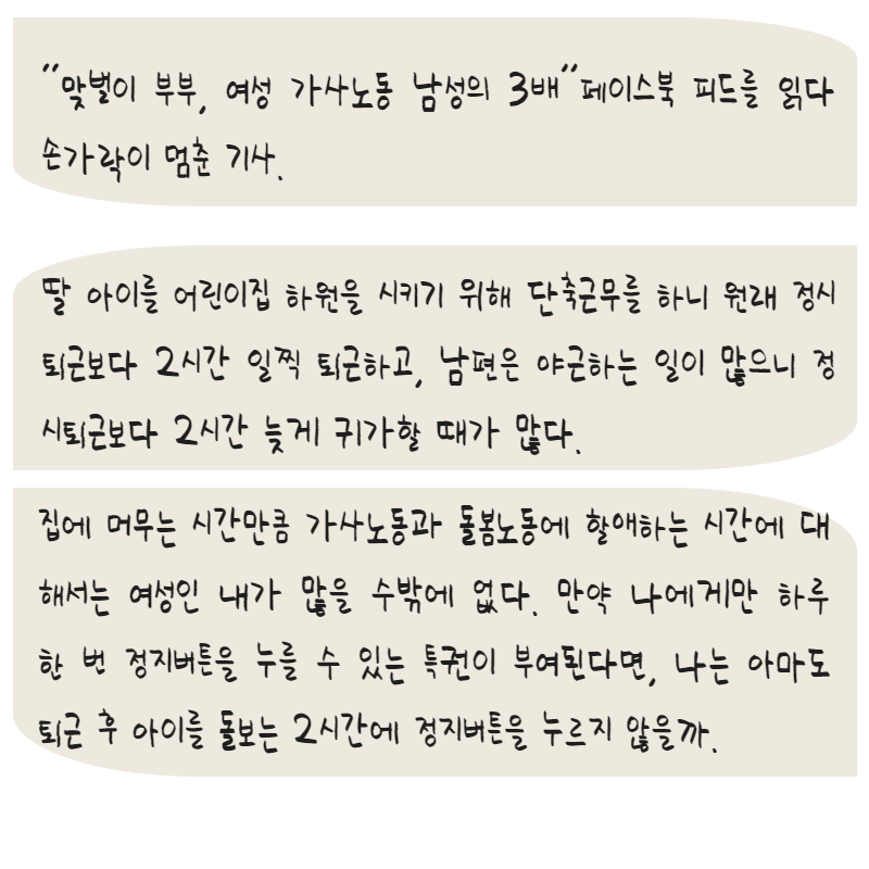 페이스북 피드를 읽다 손가락이 멈춘 기사. “맞벌이 부부, 여성 가사노동 남성의 3배” 당연한 것 아닌가 싶은 생각에 이르다, 지금의 내 삶이 당연하지 않을 날도 있으려나 싶어지는 것. 나로 따지면, 딸 조아 어린이집 하원을 시키기 위해 단축근무를 하니 원래 정시퇴근보다 2시간 일찍 퇴근하고, 남편은 야근하는 일이 많으니 정시퇴근보다 2시간 늦게 귀가할 때가 많다. 집에 머무는 시간만큼 가사노동과 돌봄노동에 할애하는 시간에 대해서는 여성인 내가 많을 수밖에 없다. 만약 나에게만 하루 한 번 정지버튼을 누를 수 있는 특권이 부여된다면, 나는 아마도 퇴근 후 아이를 돌보는 2시간에 정지버튼을 누르지 않을까. 아이와 함께 있기 싫다는 말도 아니고, 가사노동을 억울하게 더 하고 싶다는 말도 아니다. 그저 나에게도 야근이라도 좋으니 혼자 있고 싶은 시간이 필요할 뿐이다.