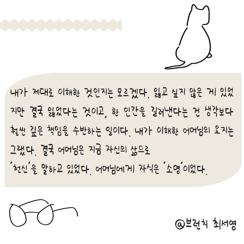 내가 제대로 이해한 것인지는 모르겠다. 잃고 싶지 않은 게 있었지만 결국 잃었다는 것이고, 한 인간을 길러낸다는 건 생각보다 훨씬 깊은 책임을 수반하는 일이다. 세대 차이로 받아들일 문제는 아니다. 공적자아와 사적자아의 균형을 지키는 건 현실적으로 매우 어려운 일이다. 인생이란 게 마음처럼 쉽게 되는 것이 아니다. 내가 이해한 어머님의 요지는 그랬다. 결국 어머님은 지금 자신의 삶으로 ‘헌신’을 말하고 있었다. 어머님에게 자식은 ‘소명’이었다. 나에게 어머님의 모습은 수행자, 스스로 무기징역을 선고하고 묵묵히 죄를 인정하고 수감생활을 하는 모범수 같아 보였다. 어머님과 나의 차이는 무엇일까. 그 안에 희망이 있고 대안이 있을 것만 같다. 오늘의 넋두리는 여기까지. 오늘도 죄책감으로 아이를 키우지 말자고 다짐하고 죄책감으로 아이를 키우는 엄마의 하루였다. 오늘도 정말 몰라 묻는다. 나는 누구인가.
