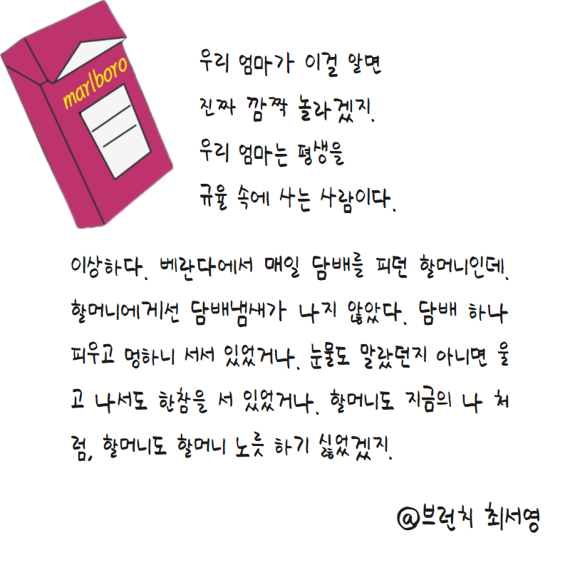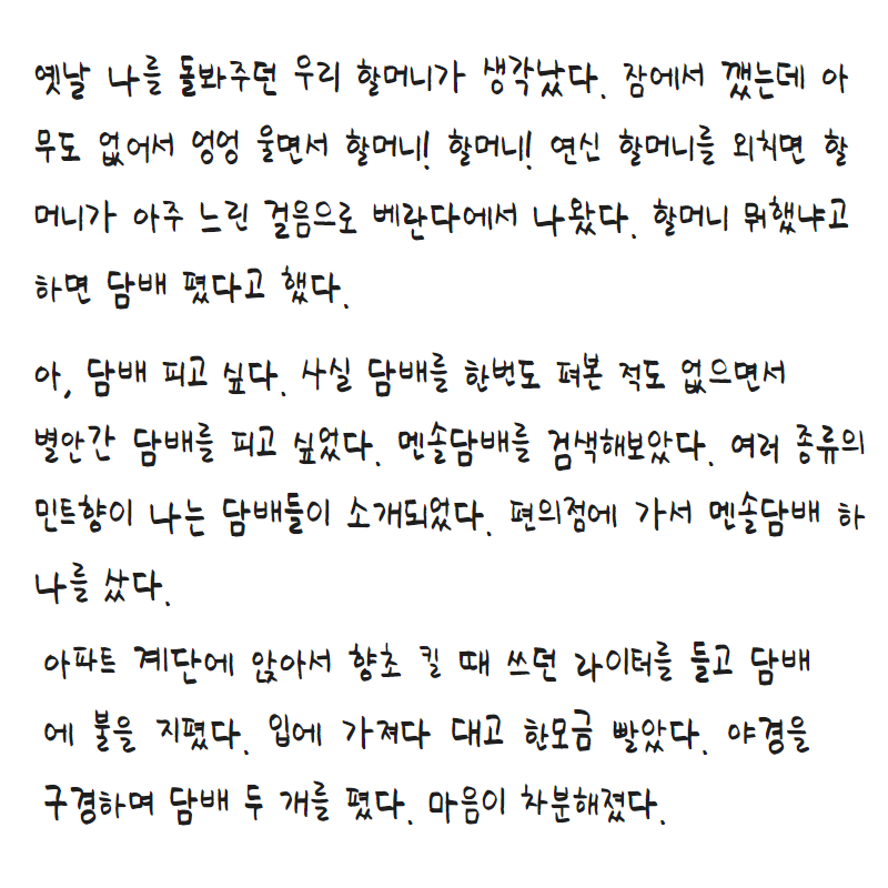담배를 피며 할머니의 마음을 상상해보았다. 할머니는 어떤 마음으로 베란다에서 담배를 폈을까. 이상하다. 베란다에서 매일 담배를 피던 할머니인데. 할머니에게선 담배냄새가 나지 않았다. 예상해보건데, 할머니는 담배 하나 피우고 멍하니 베란다에 서서 있었던거다. 울었다면 지금 나처럼 눈이 빨개져있어야했는데, 울지도 않았던지 아니면 울고 나서도 한참을 베란다에 서 있었는지. 할머니도 지금의 나 처럼, 울고 있는 아이에게 가고 싶지 않았던거다. 할머니도 할머니 노릇 하기 싫었겠지.