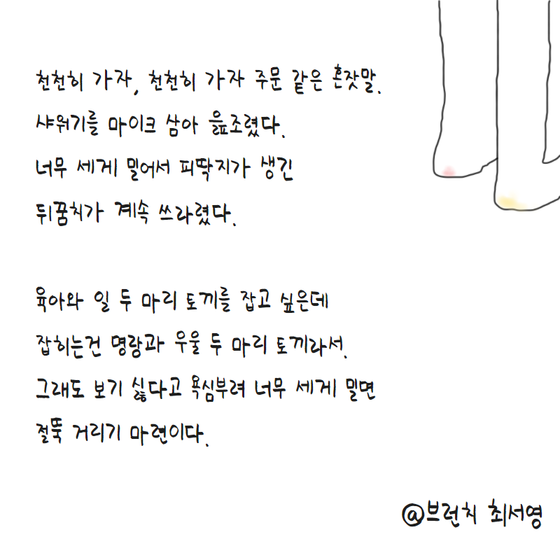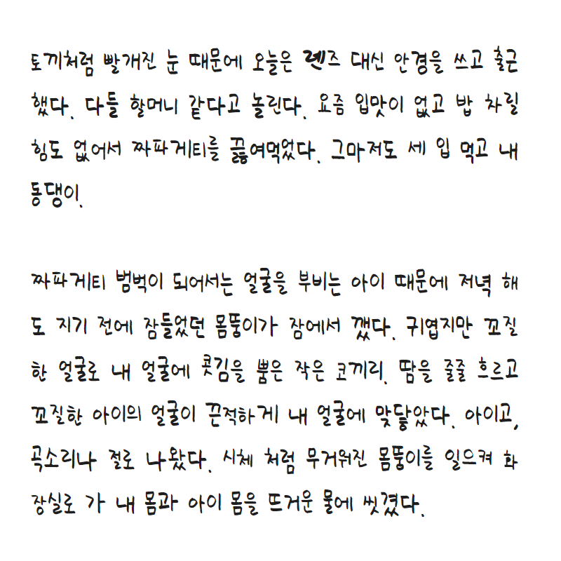 남편은 또 볼멘소리를 한다. 토끼처럼 빨개진 눈 때문에 오늘은 렌즈 대신 안경을 쓰고 출근했다. 다들 할머니 같다고 놀린다. 요즘 입맛이 없고 밥 차릴 힘도 없어서 짜파게티를 끓여먹었다. 그마저도 세 입 먹고 내동댕이. 짜파게티 범벅이 되어서는 얼굴을 부비는 아이 때문에 저녁 해도 지기 전에 잠들었던 몸뚱이가 잠에서 깼다. 귀엽지만 꼬질한 얼굴로 내 얼굴에 콧김을 뿜는 작은 코끼리. 땀을 줄줄 흐르고 꼬질한 아이의 얼굴이 끈적하게 내 얼굴에 맞닿았다. 아이고, 곡소리나 절로 나왔다. 시체 처럼 무거워진 몸뚱이를 일으켜 내 몸과 아이 몸을 뜨거운 물에 씻겼다. 천천히 가자, 천천히 가자 주문 같은 혼잣말을 샤워기를 마이크 삼아 읊조렸다. 너무 세게 밀어서 피딱지가 생긴 뒤꿈치가 바닥에 닿을 때마다 계속 쓰라렸다. 육아와 일 두 마리 토끼를 잡고 싶은데 잡히는건 명랑과 우울 두 마리 토끼라서. 그래도 보기 싫다고 욕심부려 너무 세게 밀면 절뚝 거리기 마련이다.