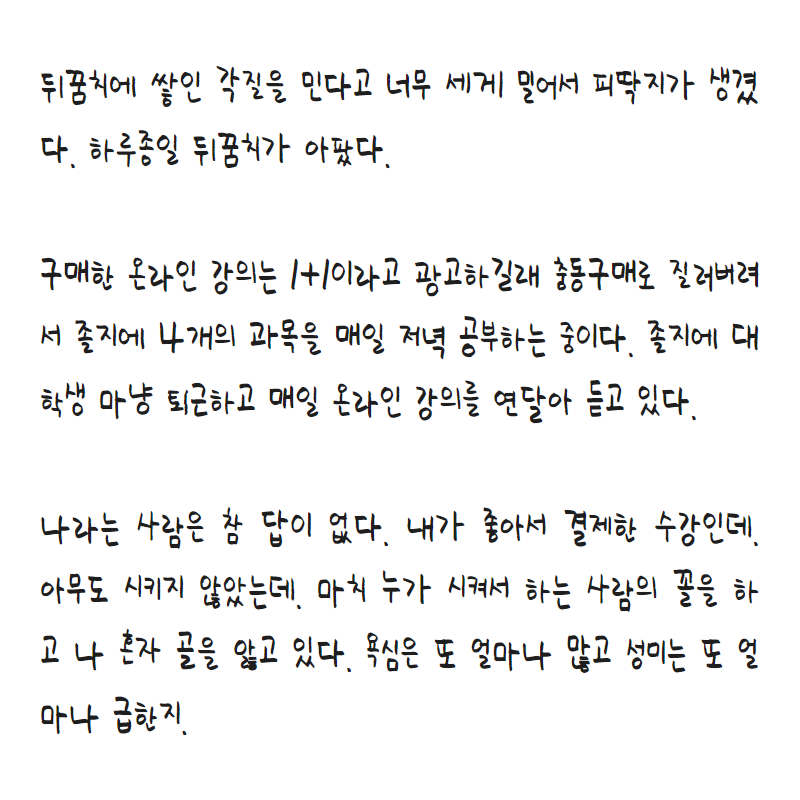뒤꿈치에 쌓인 각질을 민다고 너무 세게 밀어서 피딱지가 생겼다. 하루종일 뒤꿈치가 아팠다. 구매한 온라인 강의는 1+1이라고 광고하길래 충동구매로 질러버려서 졸지에 4개의 과목을 매일 저녁 공부하는 중이다. 육아는 언제나 뒷전인데 1+1 수강권으로 육아와 더 멀어지게 되었다. 나는 그냥 일하는 애엄마인데 졸지에 대학생 마냥 퇴근하고 매일 온라인 강의를 연달아 듣고 있다. 나라는 사람은 참 답이 없다. 내가 좋아서 결제한 수강인데. 아무도 시키지 않았는데. 마치 누가 시켜서 하는 사람의 꼴을 하고 나 혼자 골을 앓고 있다. 욕심은 또 얼마나 많고 성미는 또 얼마나 급한지.